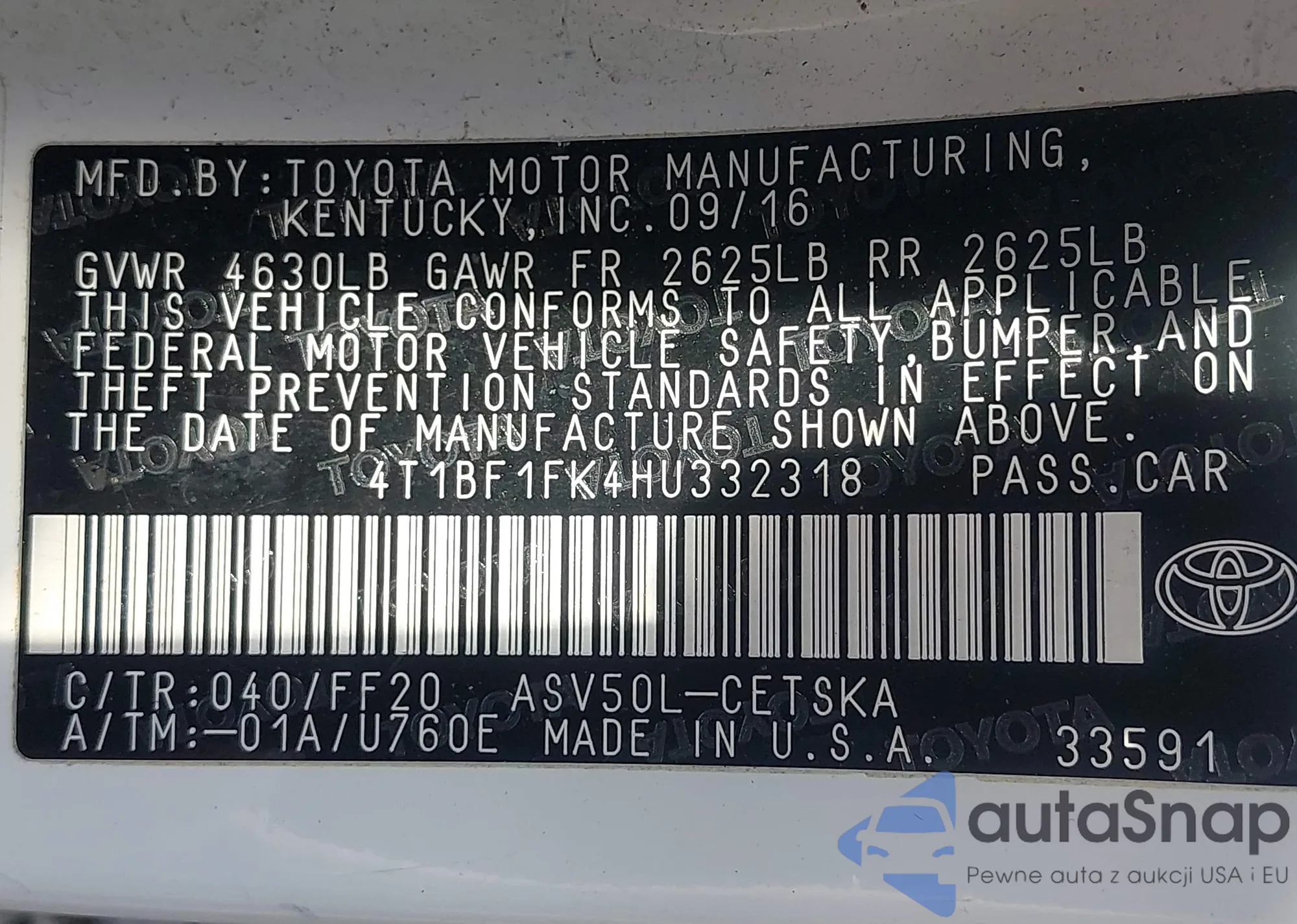 VIN: 4T1BF1FK4HU332318