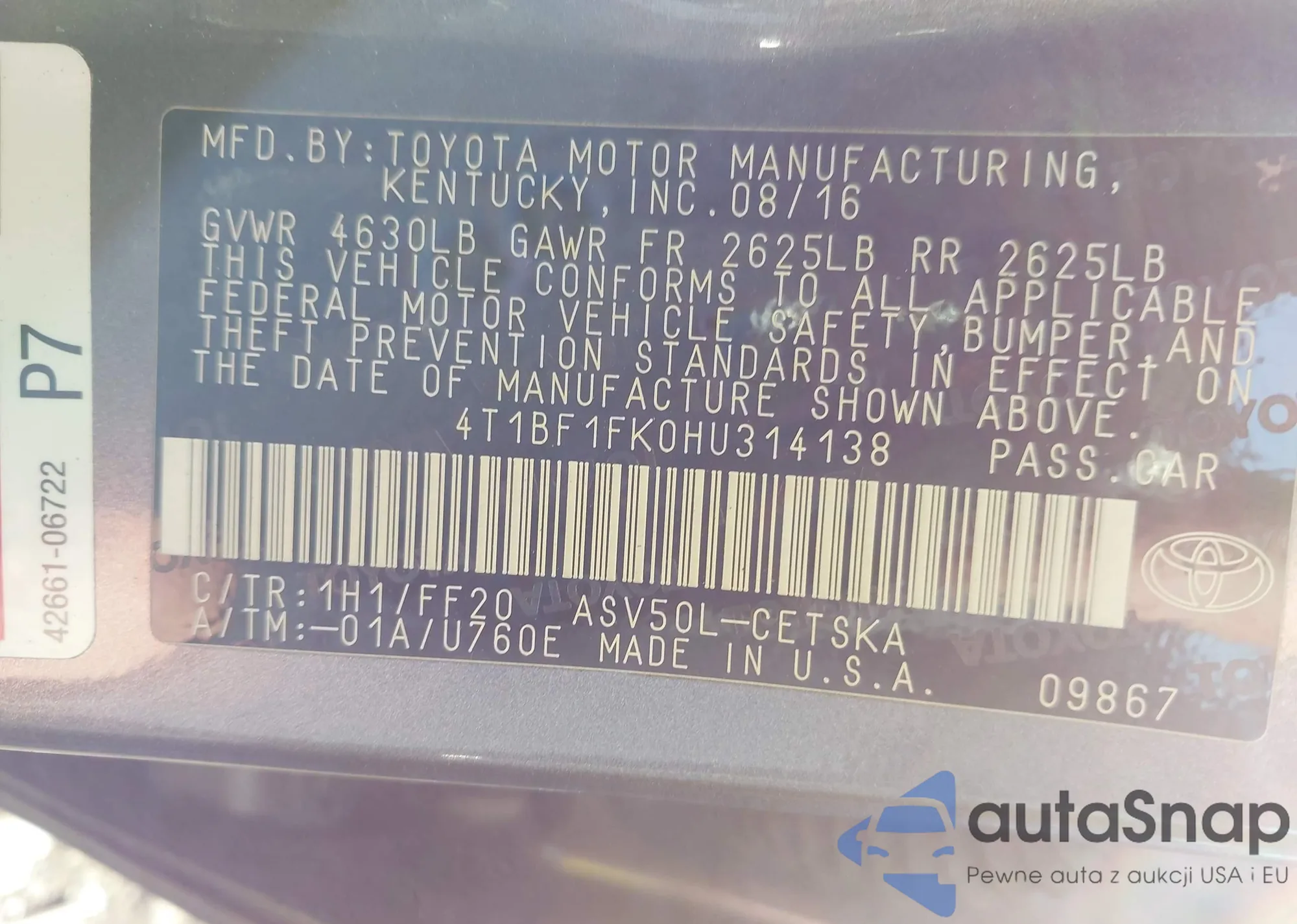 • VIN: 4T1BF1FK0HU314138