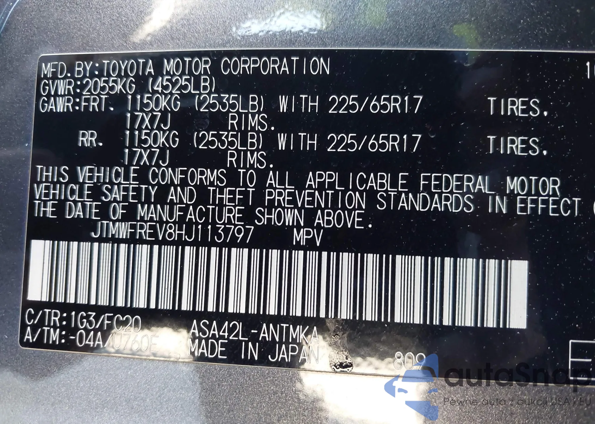 The car Toyota RAV 4 2017 (VIN JTMWFREV8HJ113797) has not been auctioned before. The documents are clean, and the mileage matches or is below the market average. Sold by an insurance company – we recommend purchase. Delivery to the port will take approx. 6–8 weeks.