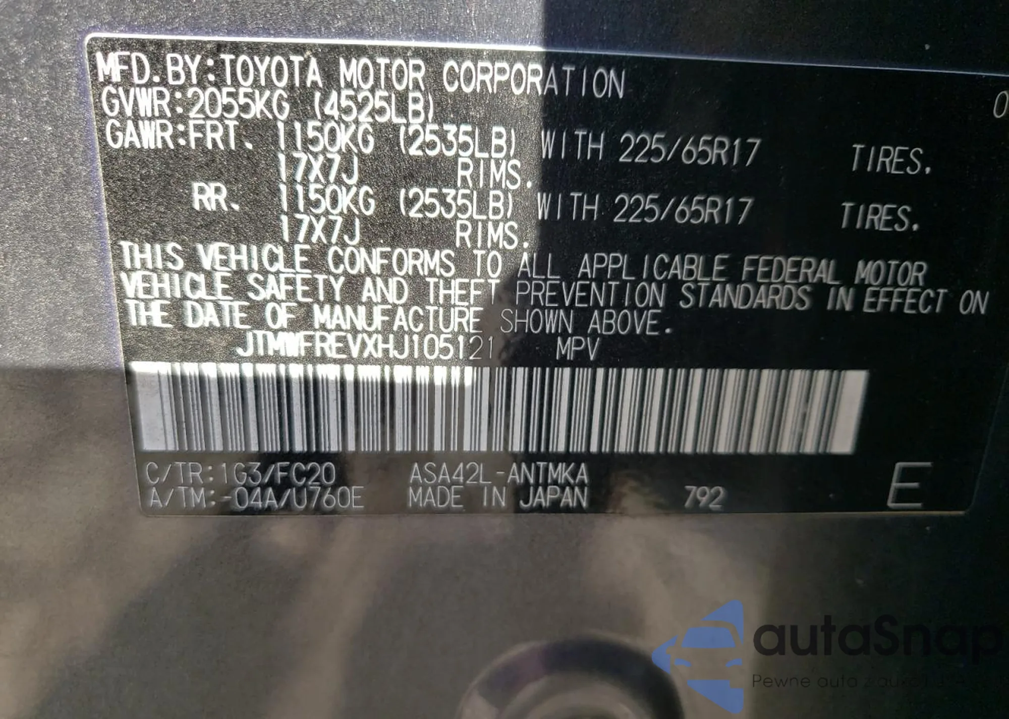 • VIN: JTMWFREVXHJ105121