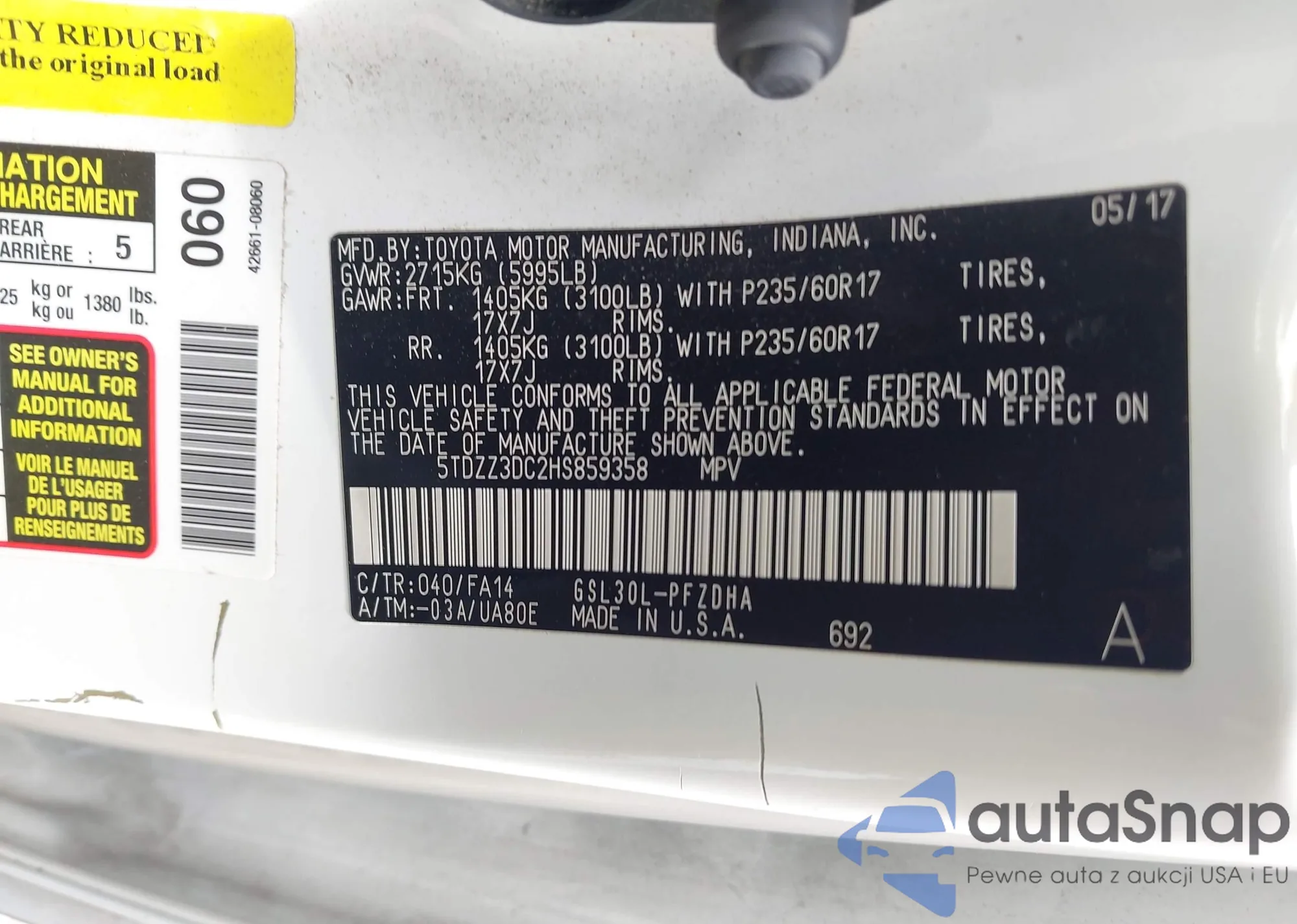 The car Toyota Sienna 2017 (VIN 5TDZZ3DC2HS859358) is sold by an unverified seller. We recommend checking the Carfax report and confirming registration possibilities before purchase.