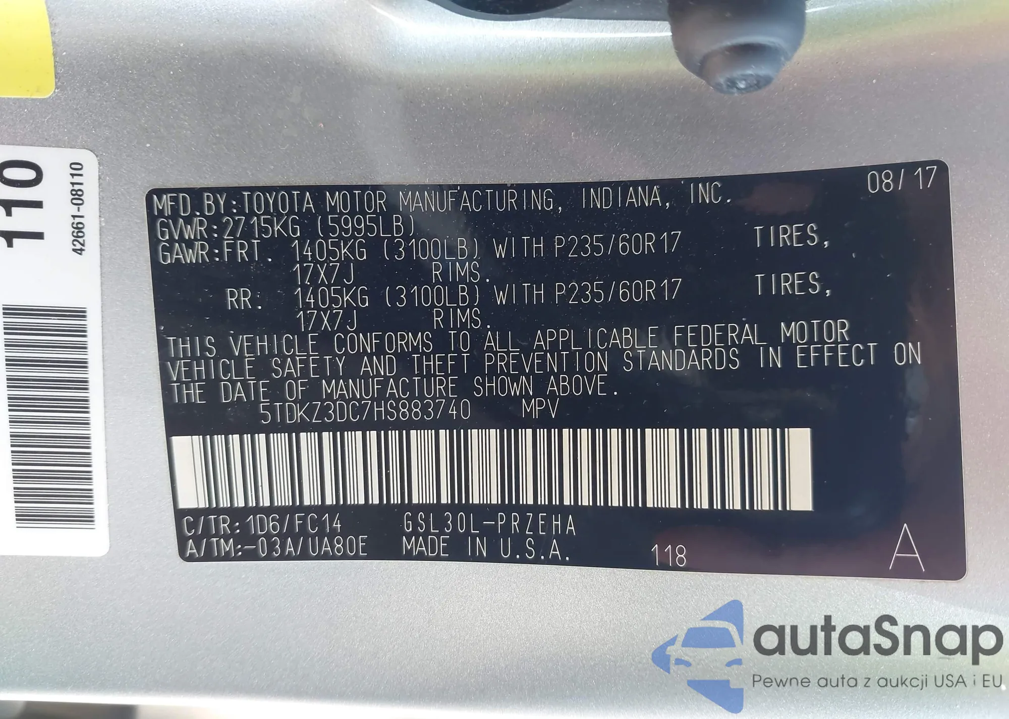 The car Toyota Sienna 2017 (VIN 5TDKZ3DC7HS883740) has not been auctioned before. The documents are clean, and the mileage matches or is below the market average. Sold by an insurance company – we recommend purchase. Delivery to the port will take approx. 6–8 weeks.