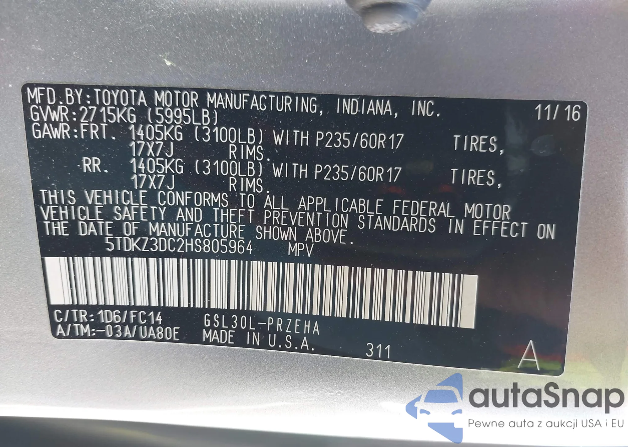 VIN: 5TDKZ3DC2HS805964