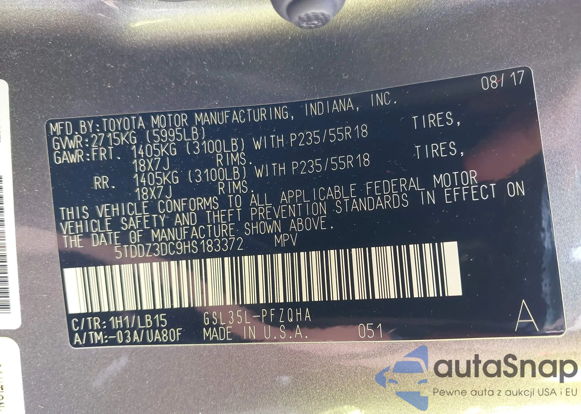 VIN: 5TDDZ3DC9HS183372