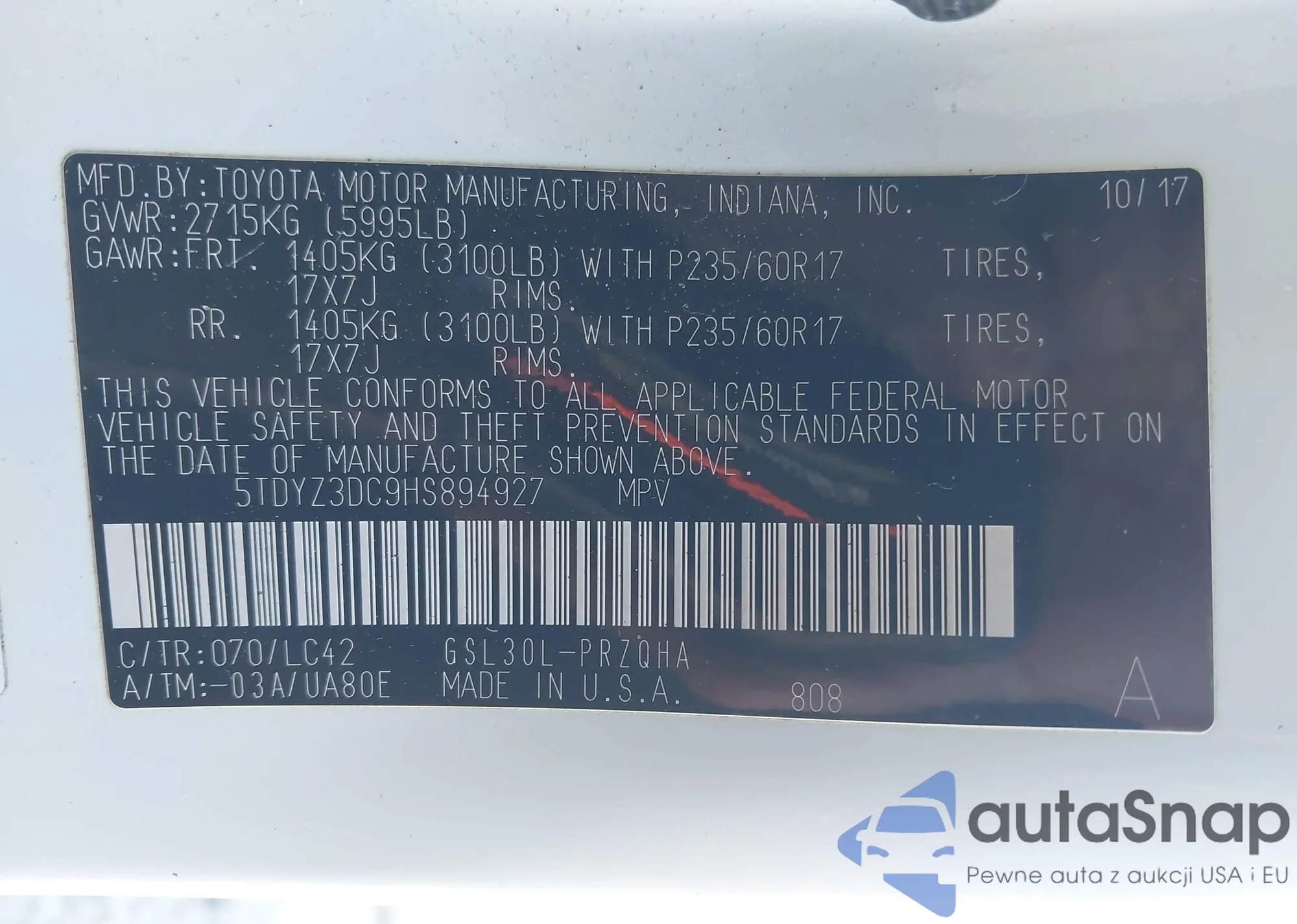 The car Toyota Sienna 2017 (VIN 5TDYZ3DC9HS894927) has not been auctioned before. The documents are clean, and the mileage matches or is below the market average. Sold by an insurance company – we recommend purchase. Delivery to the port will take approx. 6–8 weeks.