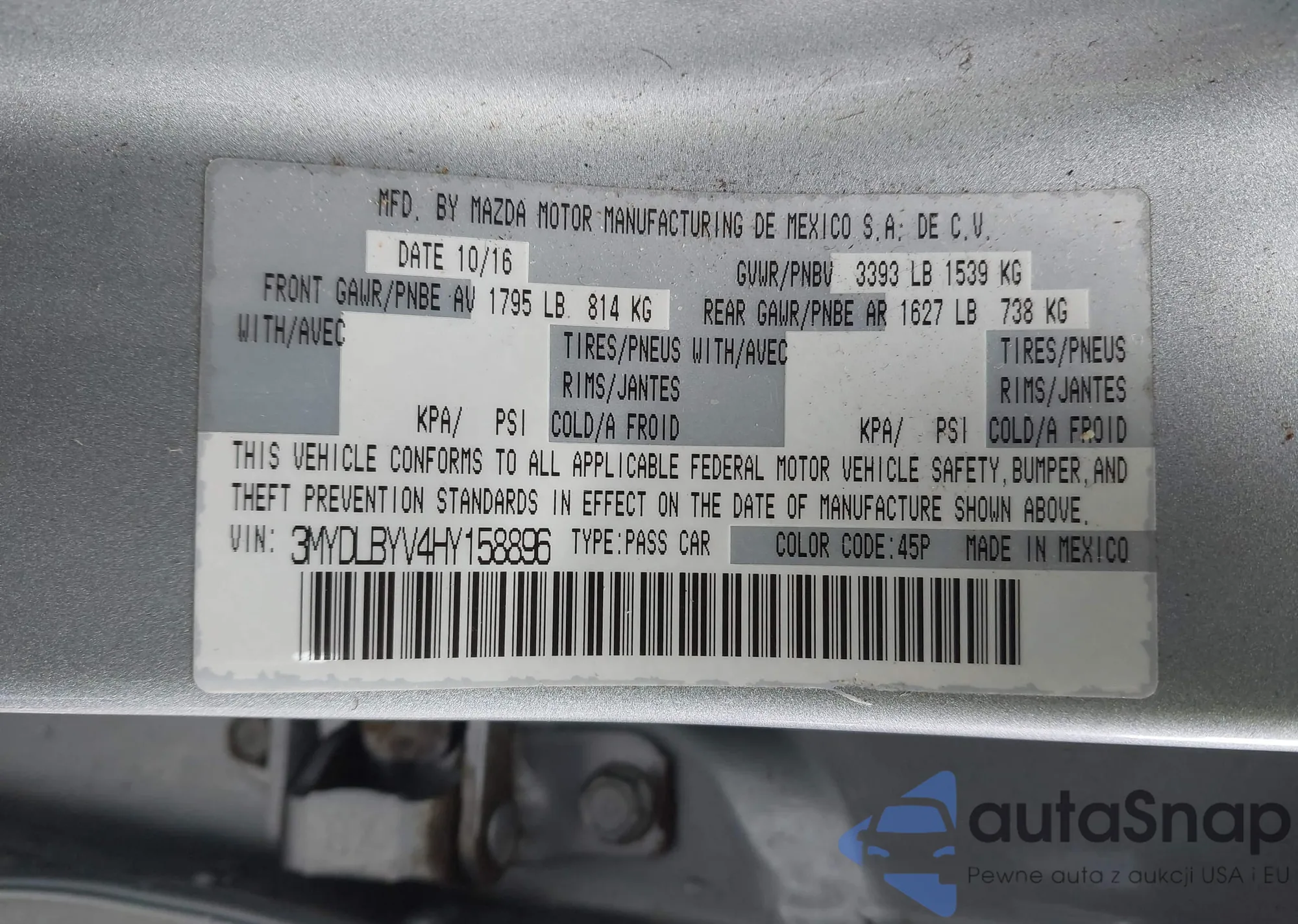 The car Toyota Yaris 2017 (VIN 3MYDLBYV4HY158896) has documents that prevent registration. Export and registration may be difficult. Contact AutaSnap experts to find alternatives.