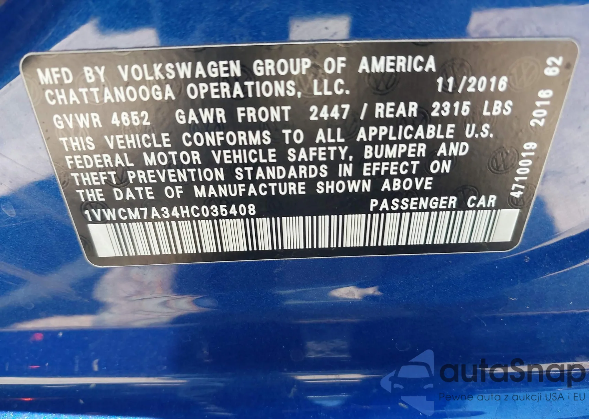 VIN: 1VWCM7A34HC035408
