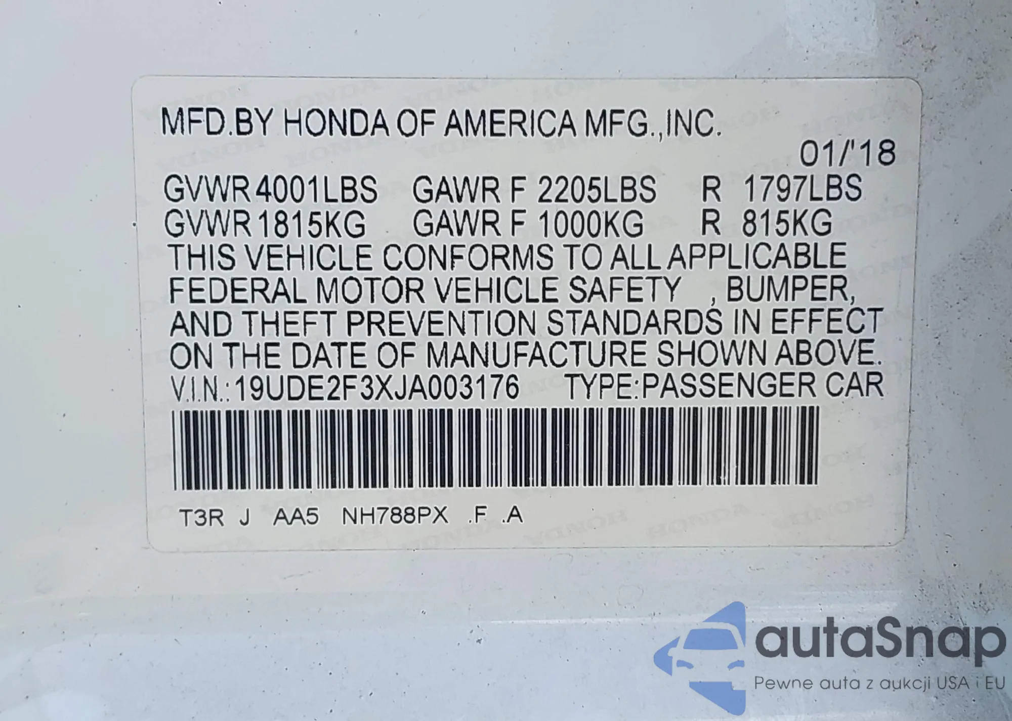 VIN: 19UDE2F3XJA003176