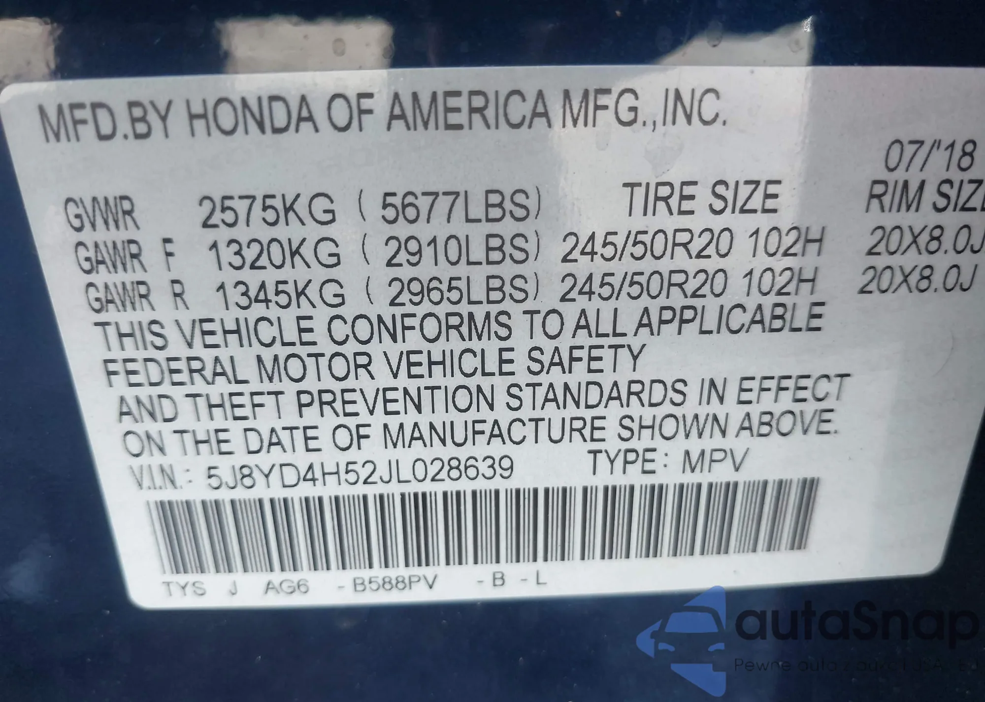 VIN: 5J8YD4H52JL028639