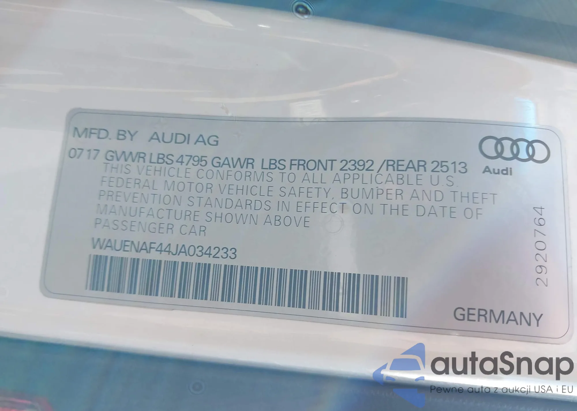 The car Audi A4 2018 (VIN WAUENAF44JA034233) has not been auctioned before. The documents are clean, and the mileage matches or is below the market average. Sold by an insurance company – we recommend purchase. Delivery to the port will take approx. 6–8 weeks.