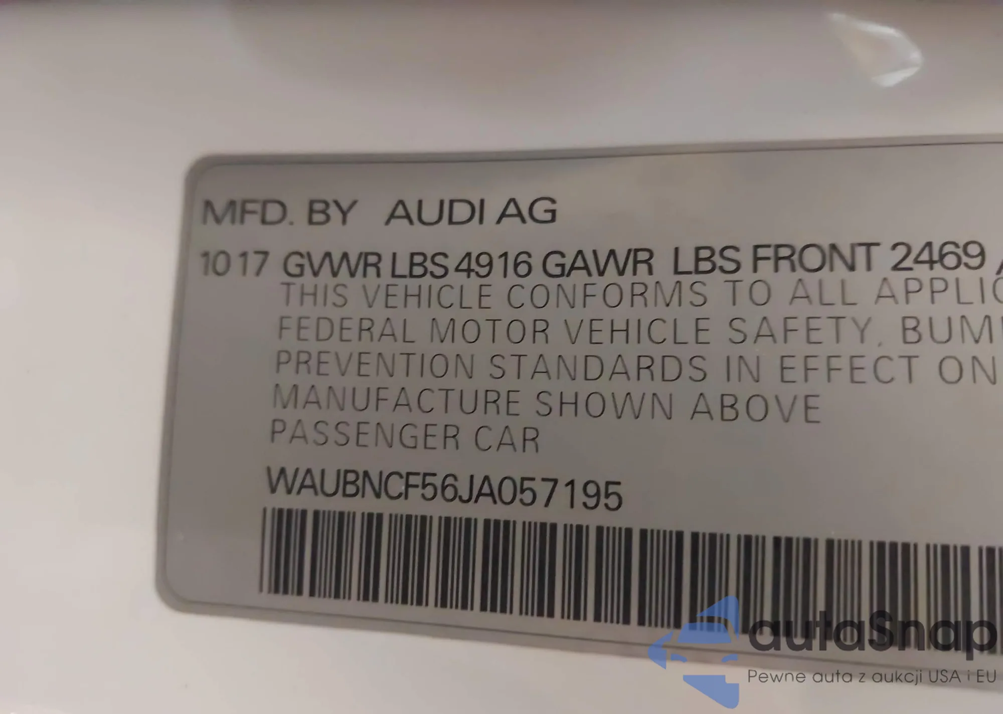 The car Audi A5 2018 (VIN WAUBNCF56JA057195) has not been auctioned before (0 auctions). The documents are clean, and the mileage matches or is below the market average. Sold by an insurance company – we recommend purchase. Delivery to the port will take approx. 6–8 weeks.