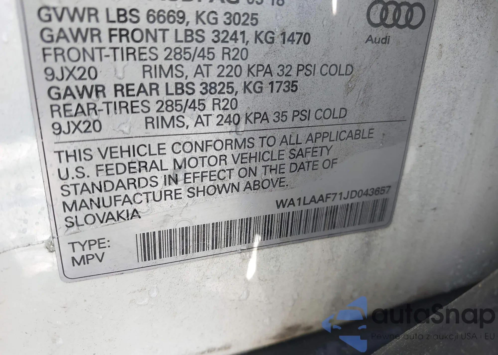 • VIN: WA1LAAF71JD043657