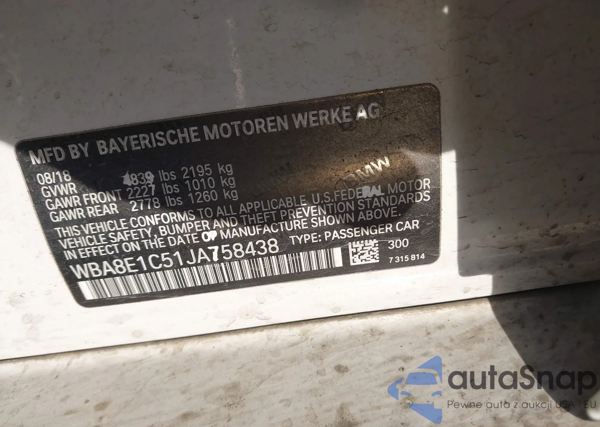 VIN: WBA8E1C51JA758438