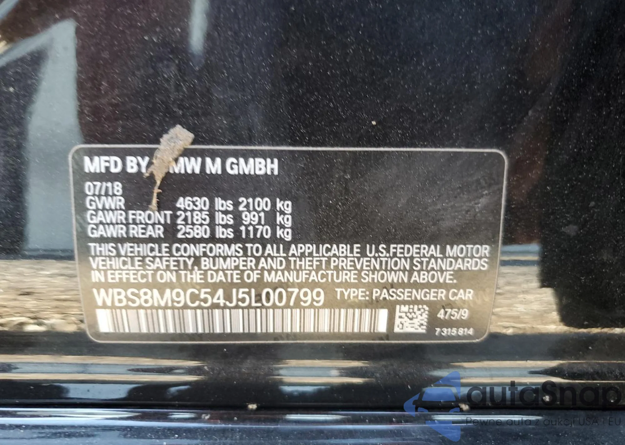 The car BMW M3 2018 (VIN WBS8M9C54J5L00799) has not been auctioned before. The documents are clean, and the mileage matches or is below the market average. Sold by an insurance company – we recommend purchase. Delivery to the port will take approx. 6–8 weeks.