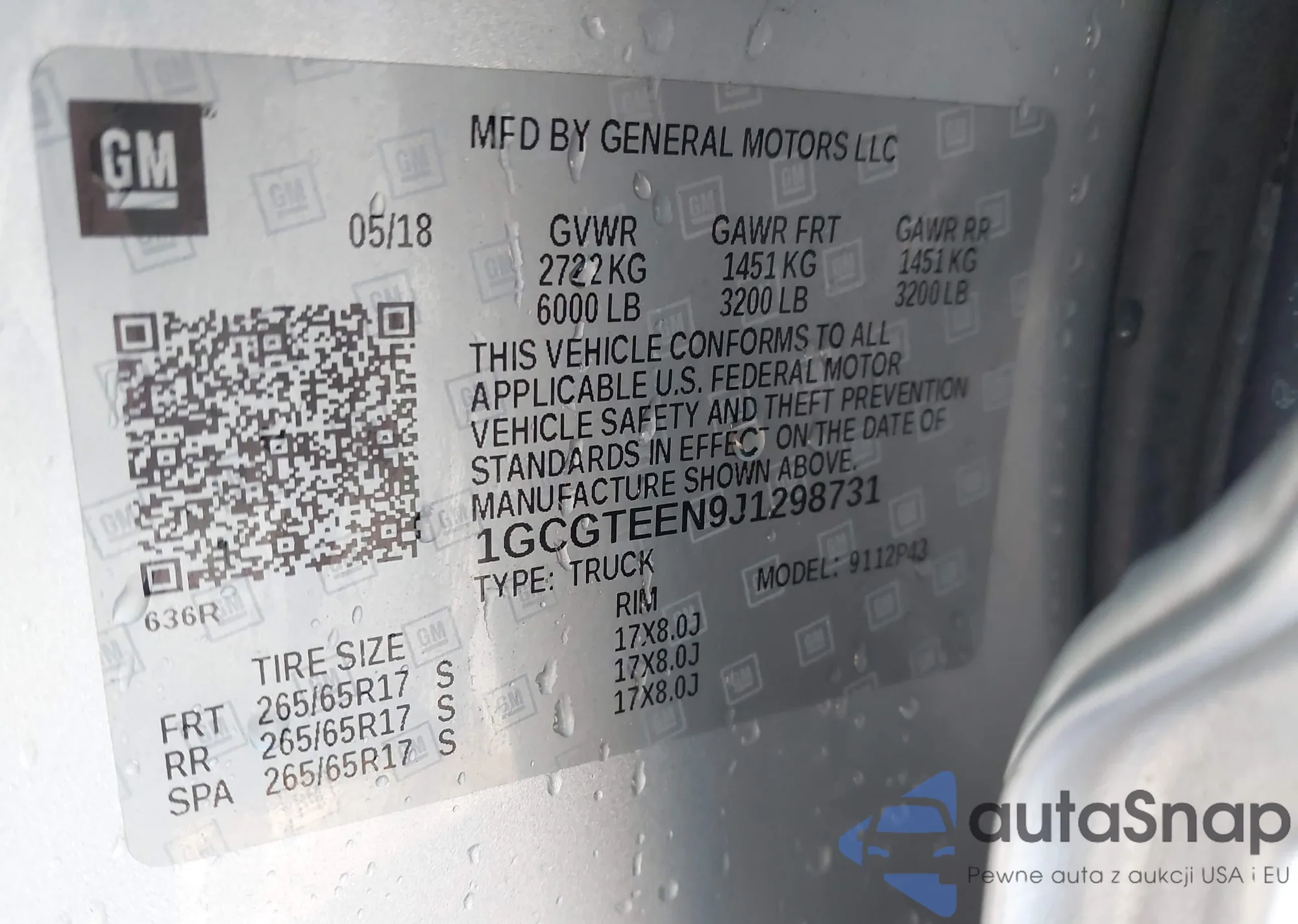 The car Chevrolet Colorado 2018 (VIN 1GCGTEEN9J1298731) has documents that prevent registration. Export and registration may be difficult. Contact AutaSnap experts to find alternatives.