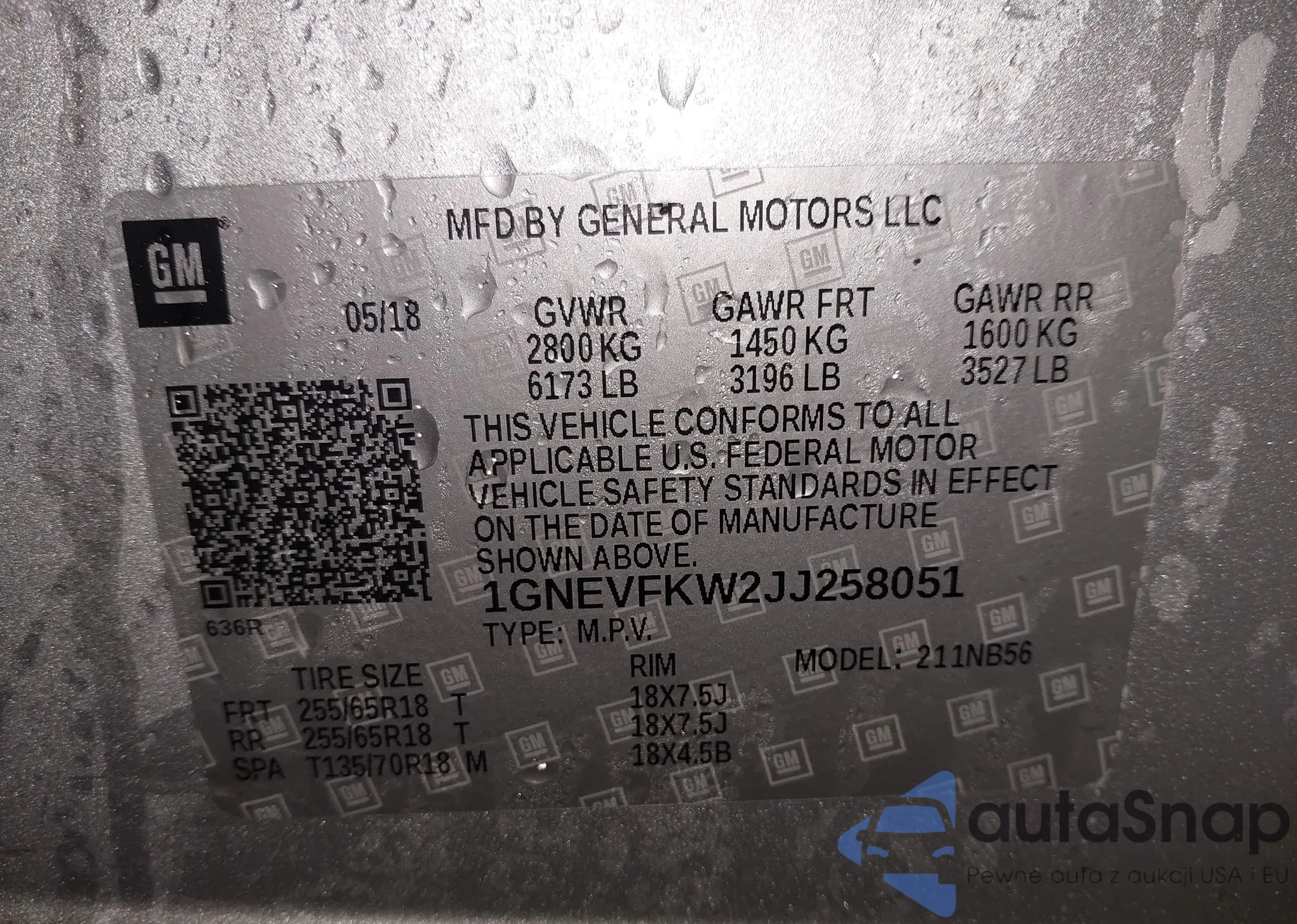 The car Chevrolet Traverse 2018 (VIN 1GNEVFKW2JJ258051) has not been auctioned before. The documents are clean, and the mileage matches or is below the market average. Sold by an insurance company – we recommend purchase. Delivery to the port will take approx. 6–8 weeks.