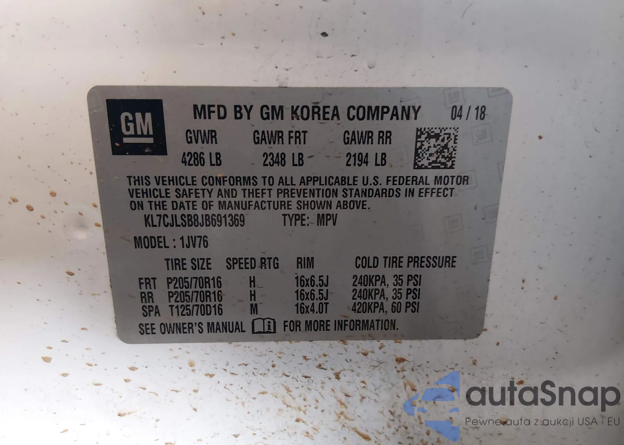 The car Chevrolet Trax 2018 (VIN KL7CJLSB8JB691369) has not been auctioned before. The documents are clean, and the mileage matches or is below the market average. Sold by an insurance company – we recommend purchase. Delivery to the port will take approx. 6–8 weeks.