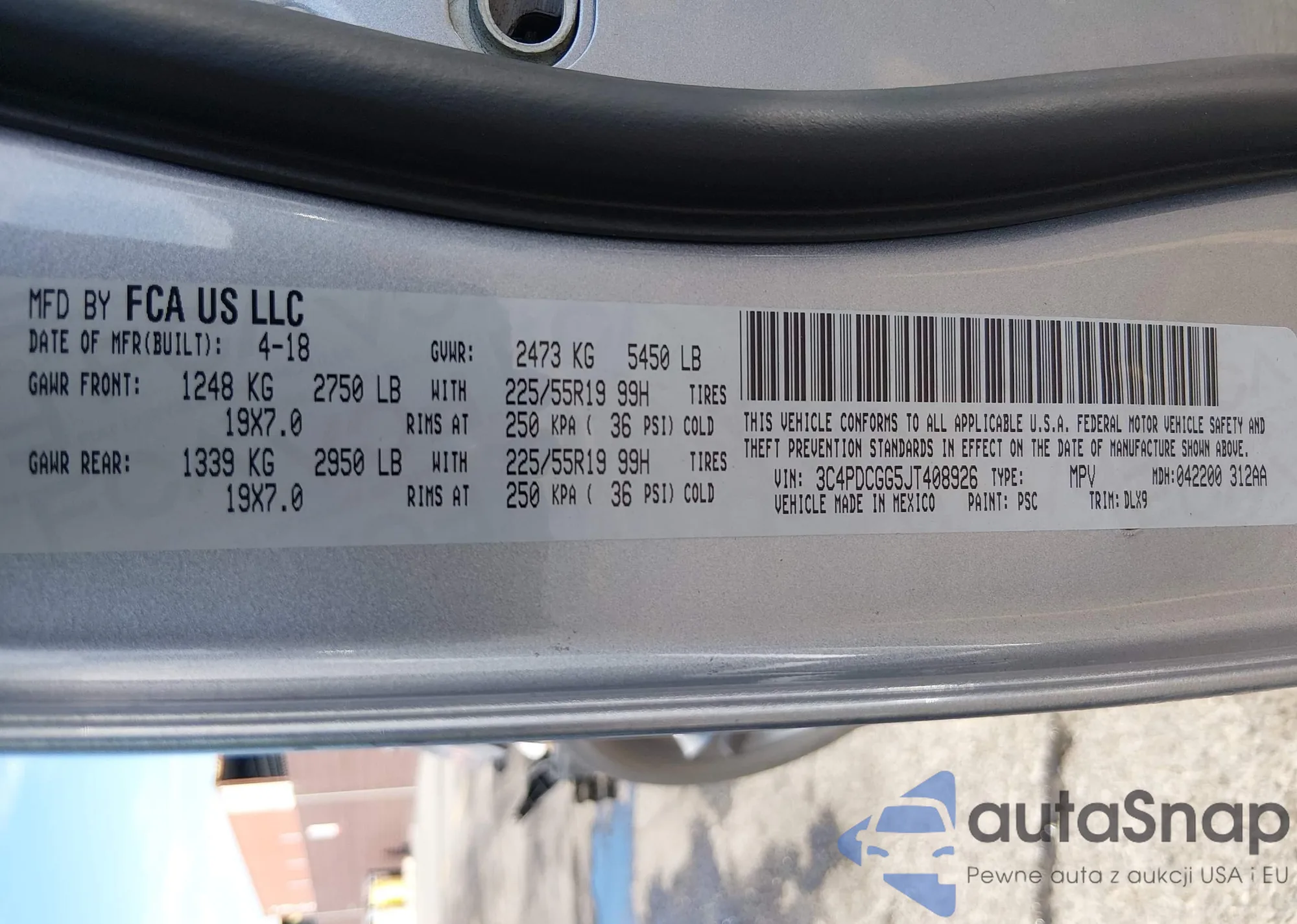 The car Dodge Journey 2018 (VIN 3C4PDCGG5JT408926) has not been auctioned before. The documents are clean, and the mileage matches or is below the market average. Sold by an insurance company – we recommend purchase. Delivery to the port will take approx. 6–8 weeks.