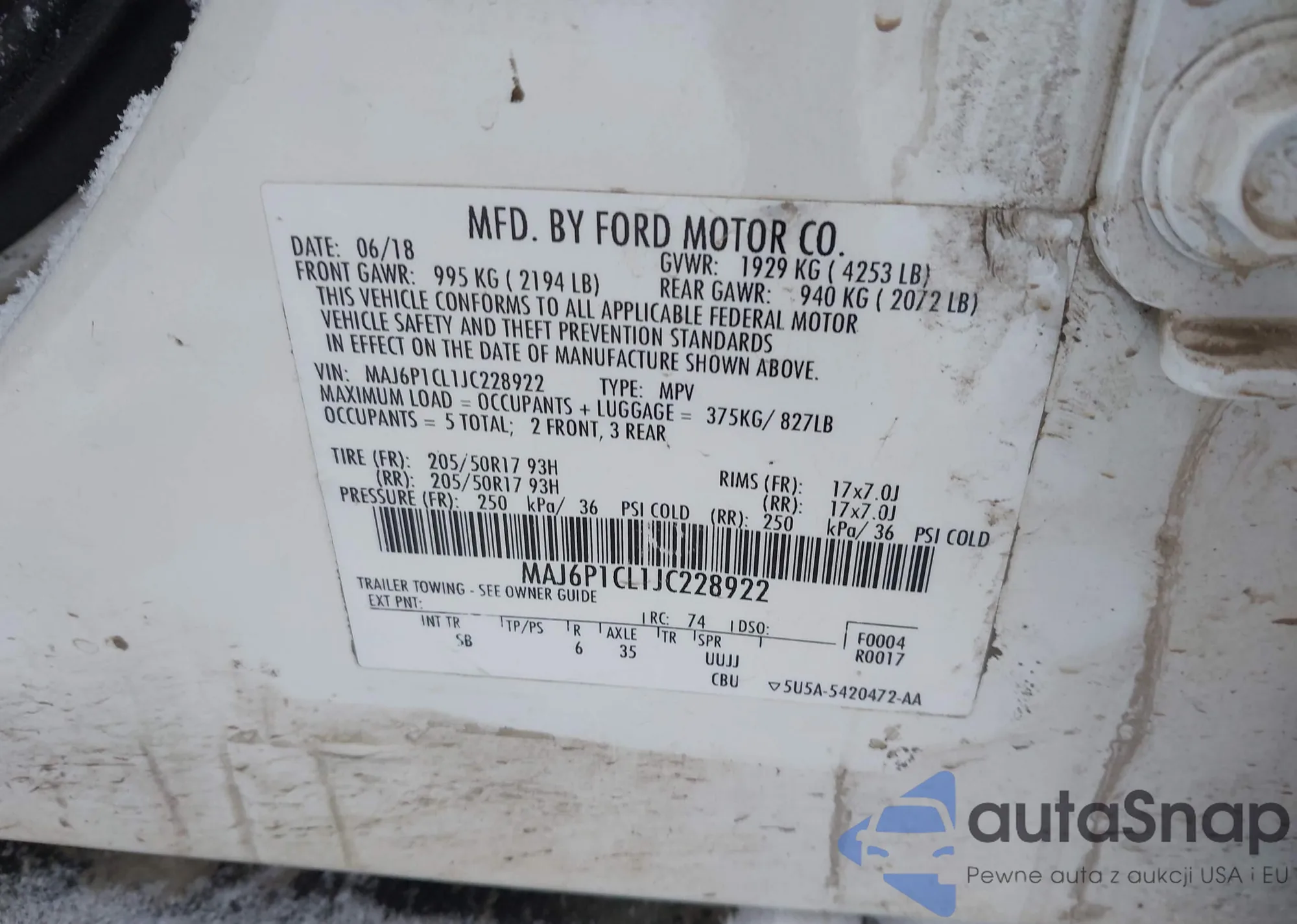 • VIN: MAJ6P1CL1JC228922