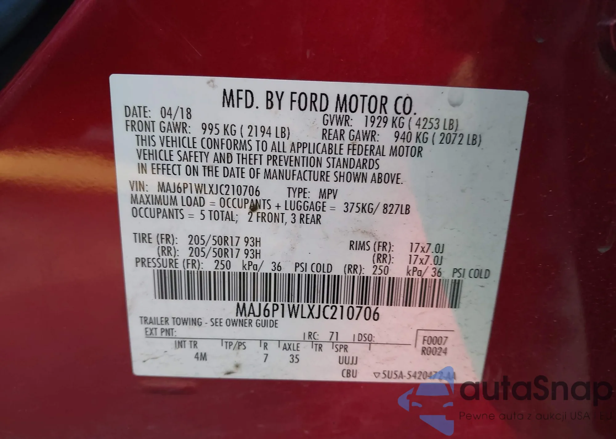 • VIN: MAJ6P1WLXJC210706