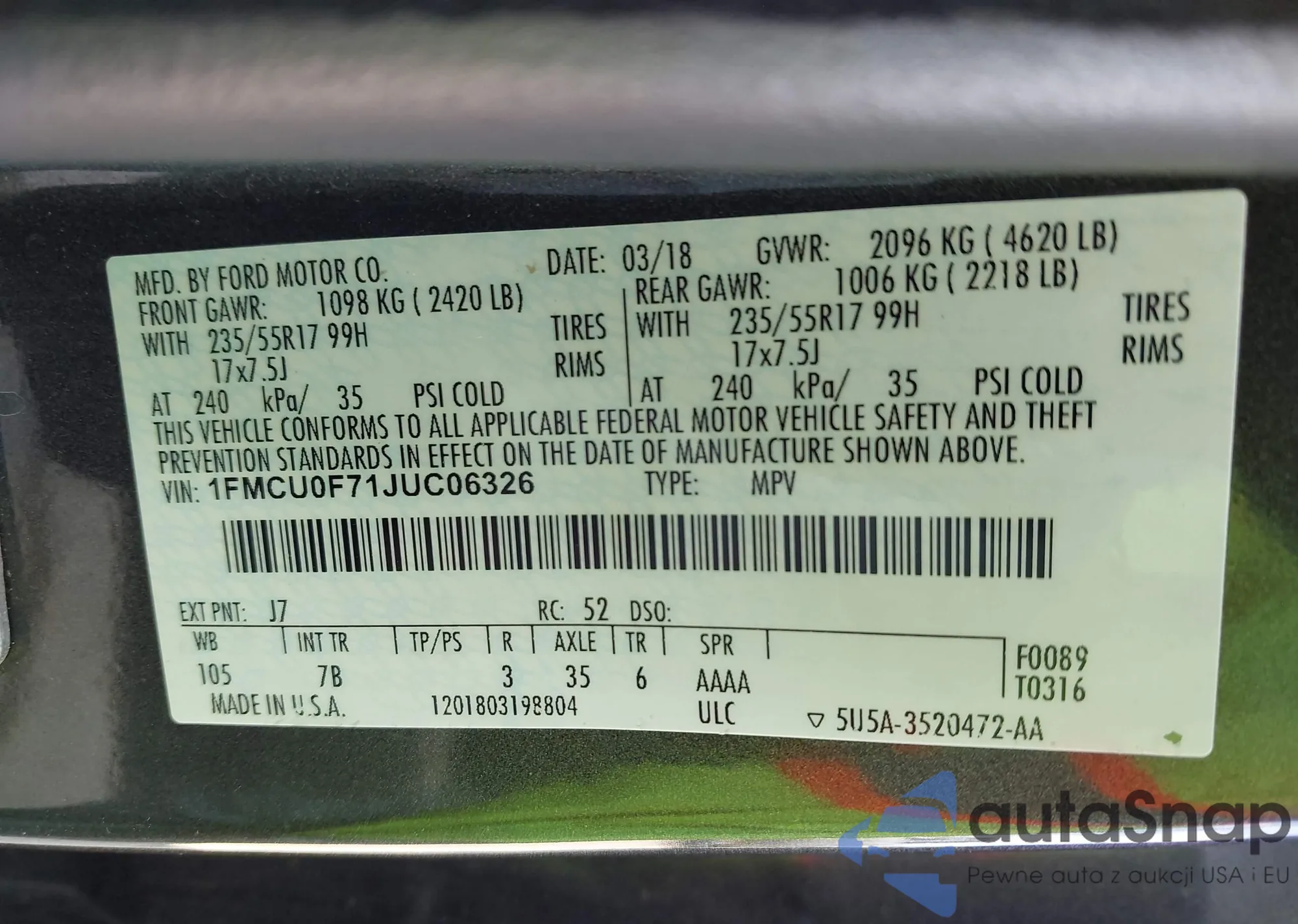 • VIN: 1FMCU0F71JUC06326