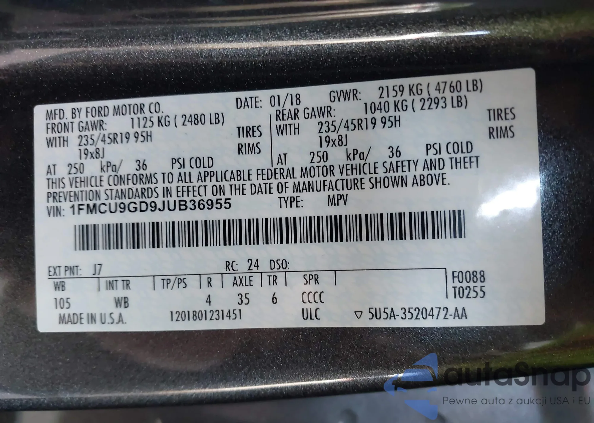 VIN: 1FMCU9GD9JUB36955