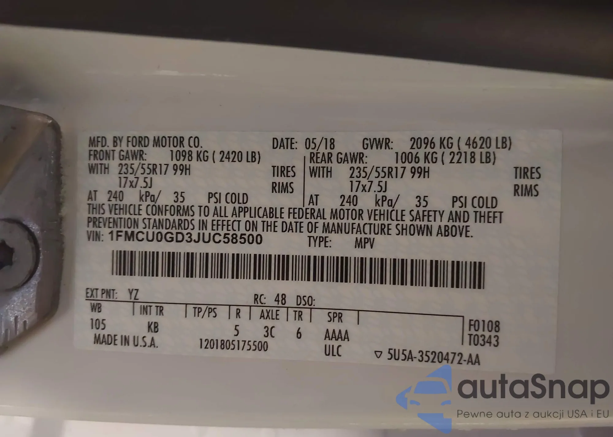 The car Ford Escape 2018 (VIN 1FMCU0GD3JUC58500) has not been auctioned before. The documents are clean, and the mileage matches or is below the market average. Sold by an insurance company – we recommend purchase. Delivery to the port will take approx. 6–8 weeks.