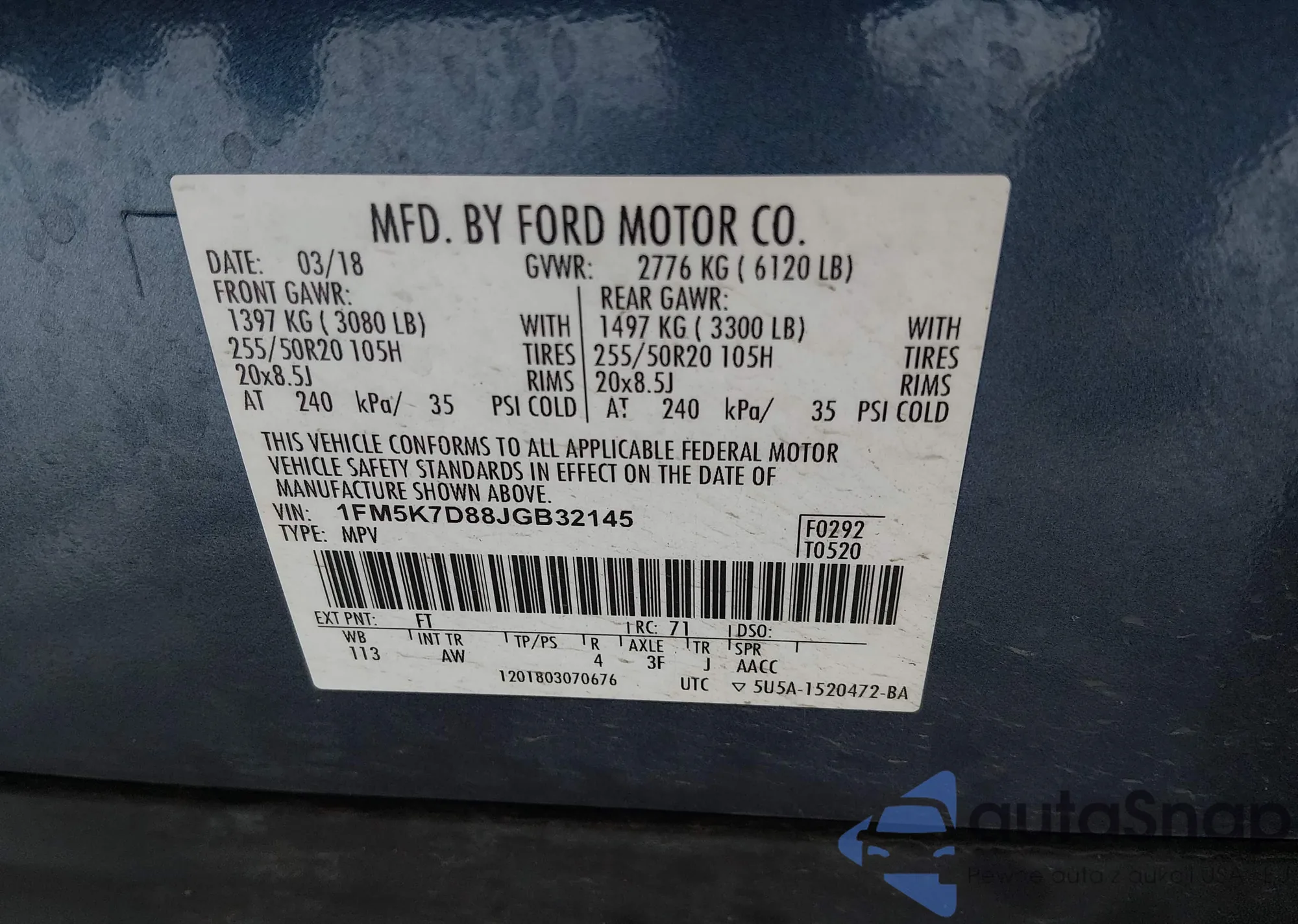 VIN: 1FM5K7D88JGB32145