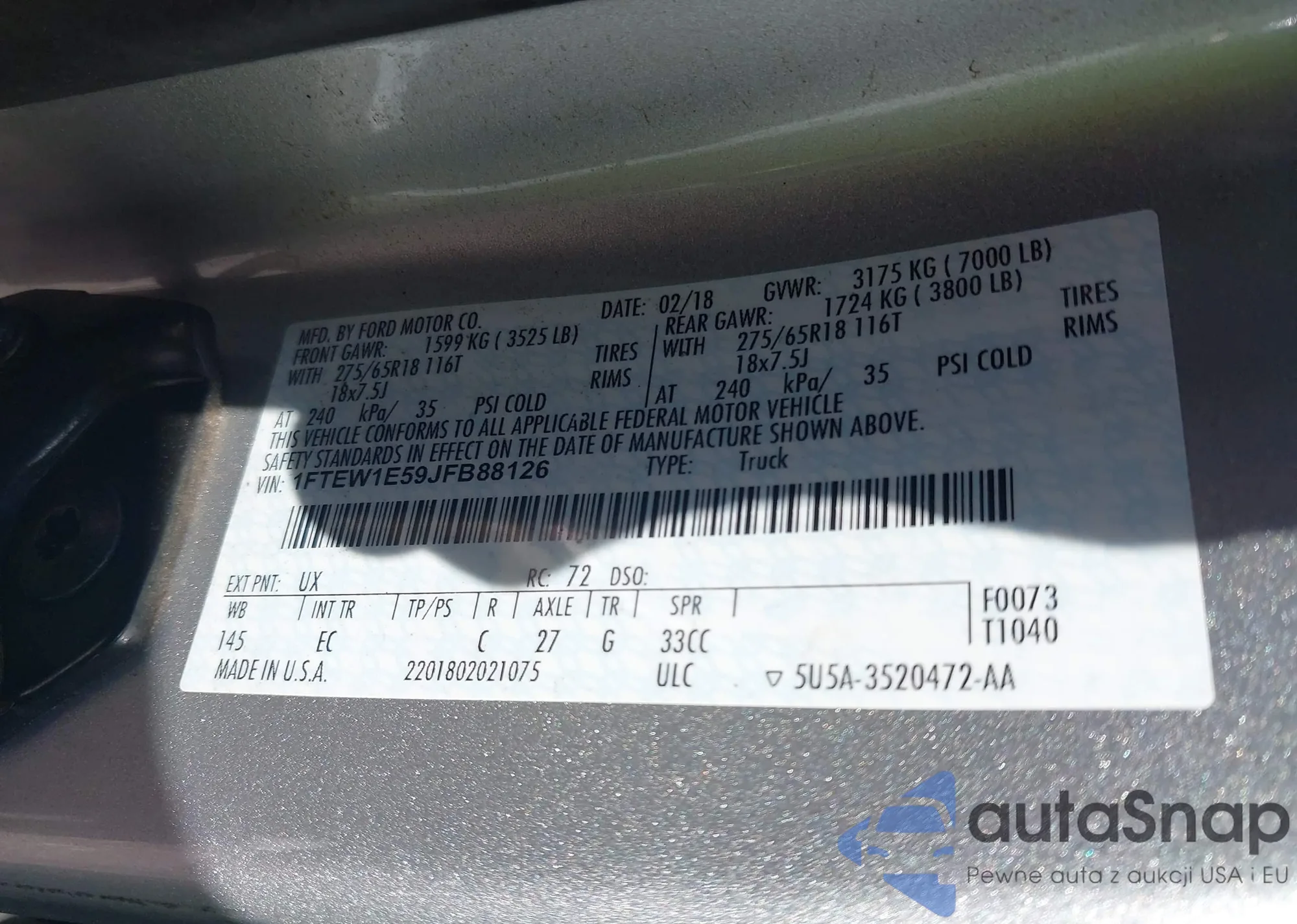 The car Ford F-150 2018 (VIN 1FTEW1E59JFB88126) has not been auctioned before. The documents are clean, and the mileage matches or is below the market average. Sold by an insurance company – we recommend purchase. Delivery to the port will take approx. 6–8 weeks.