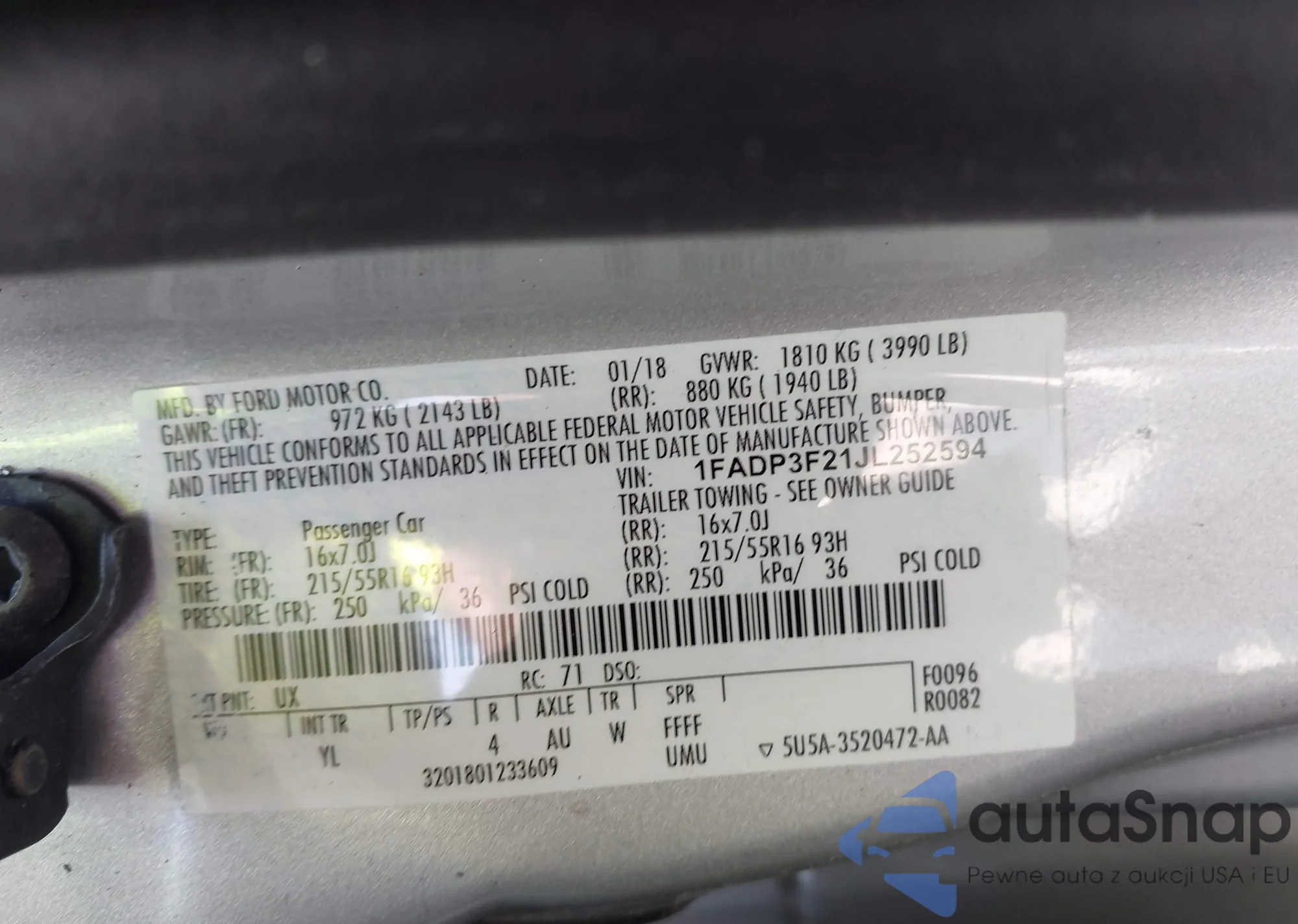 The car Ford Focus 2018 (VIN 1FADP3F21JL252594) has not been auctioned before. The documents are clean, and the mileage matches or is below the market average. Sold by an insurance company – we recommend purchase. Delivery to the port will take approx. 6–8 weeks.