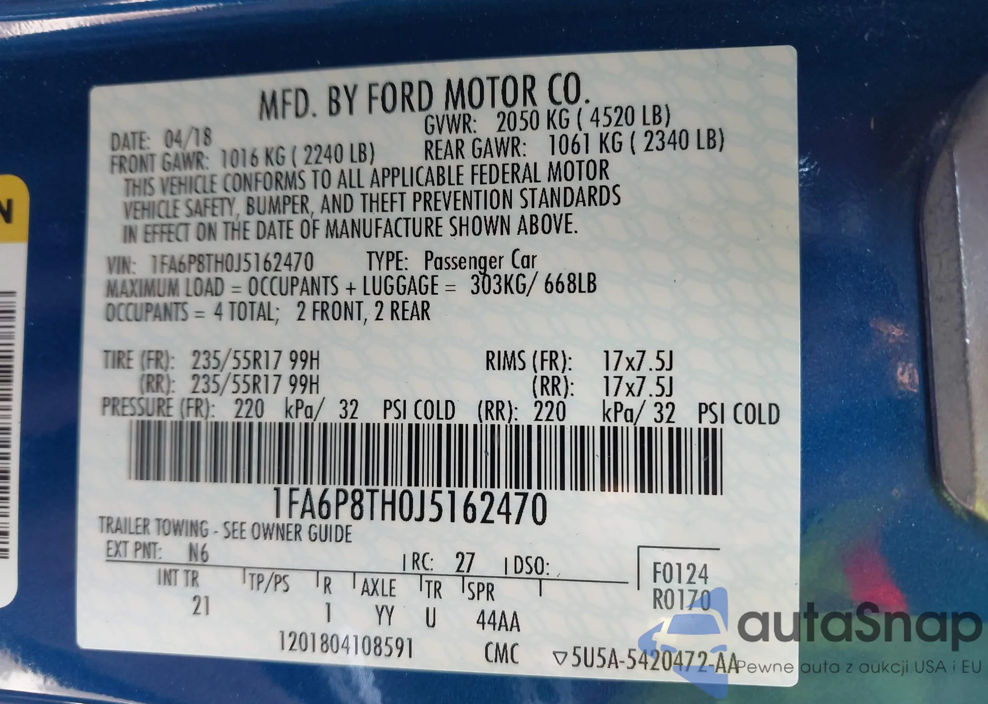 The car Ford Mustang 2018 (VIN 1FA6P8TH0J5162470) has not been auctioned before. The documents are clean, and the mileage matches or is below the market average. Sold by an insurance company – we recommend purchase. Delivery to the port will take approx. 6–8 weeks.