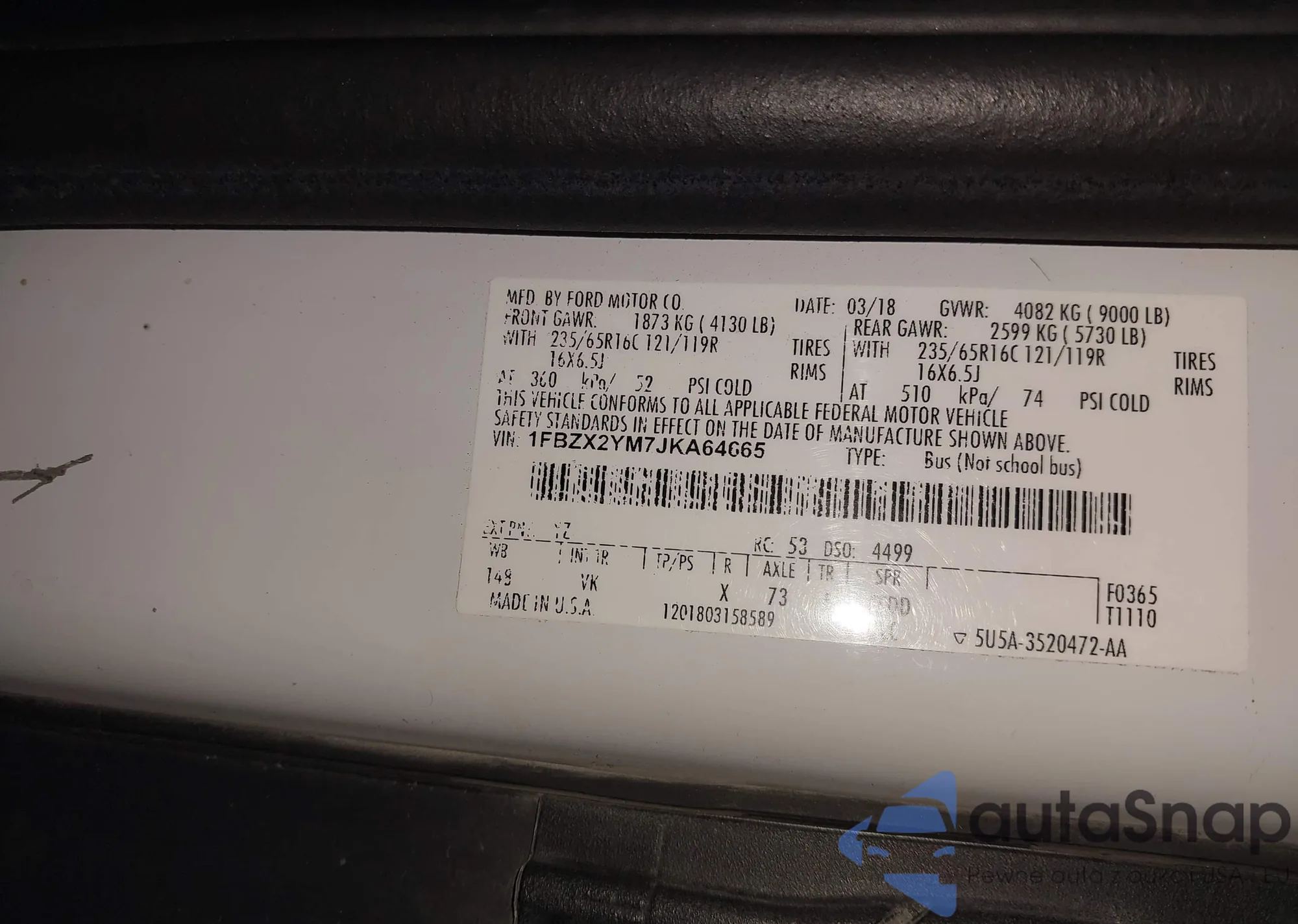 The car Ford Transit 2018 (VIN 1FBZX2YM7JKA64665) has documents that prevent registration. Export and registration may be difficult. Contact AutaSnap experts to find alternatives.
