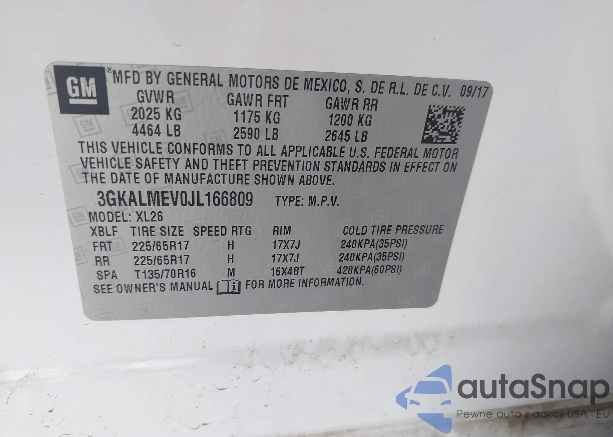VIN: 3GKALMEV0JL166809