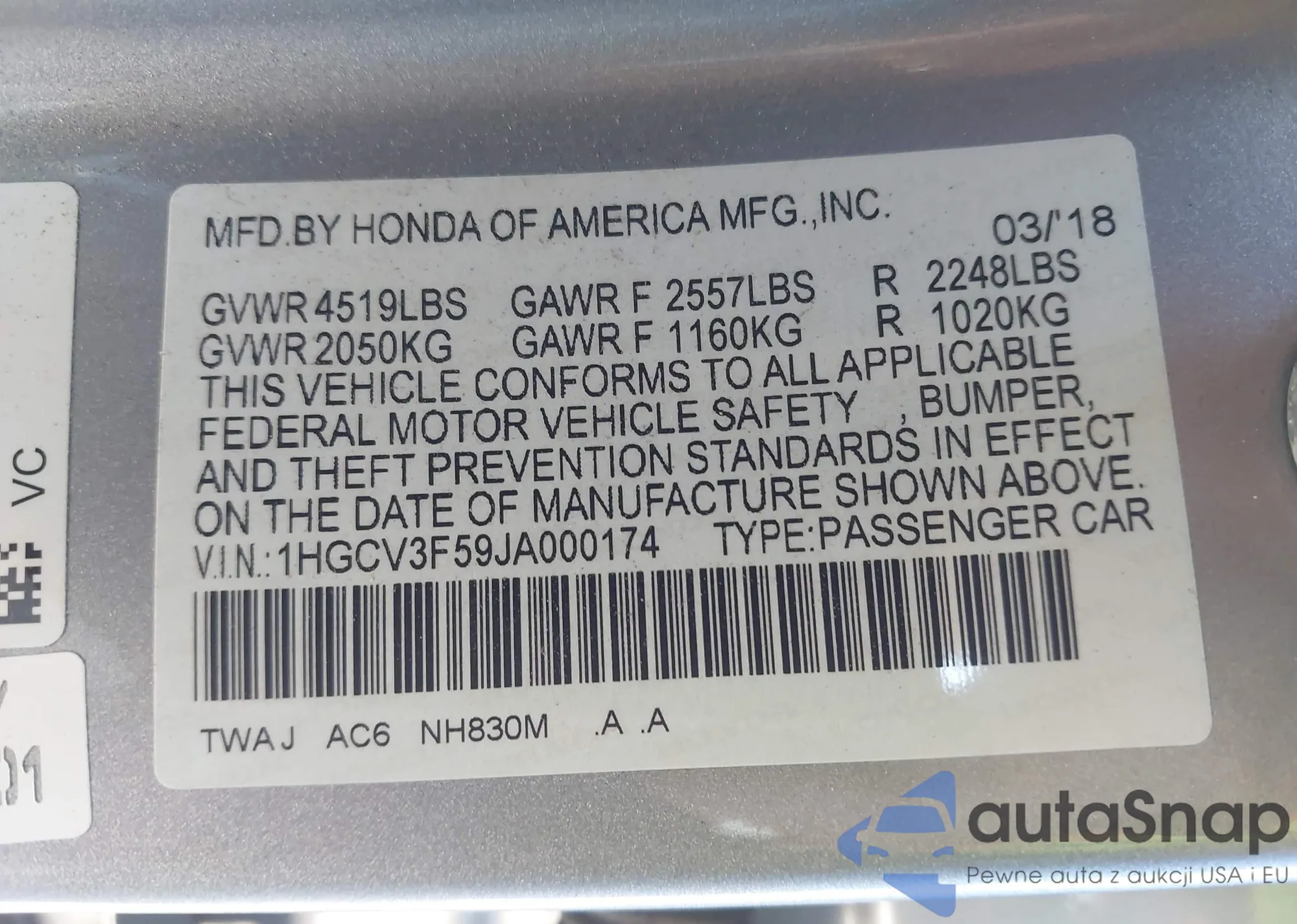 The car Honda Accord 2018 (VIN 1HGCV3F59JA000174) has not been auctioned before. The documents are clean, and the mileage matches or is below the market average. Sold by an insurance company – we recommend purchase. Delivery to the port will take approx. 6–8 weeks.