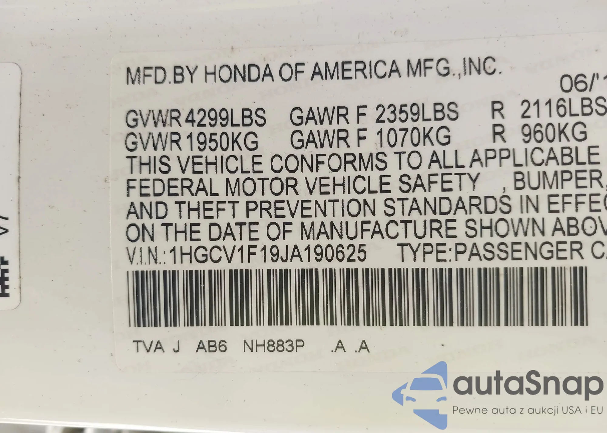 VIN: 1HGCV1F19JA190625