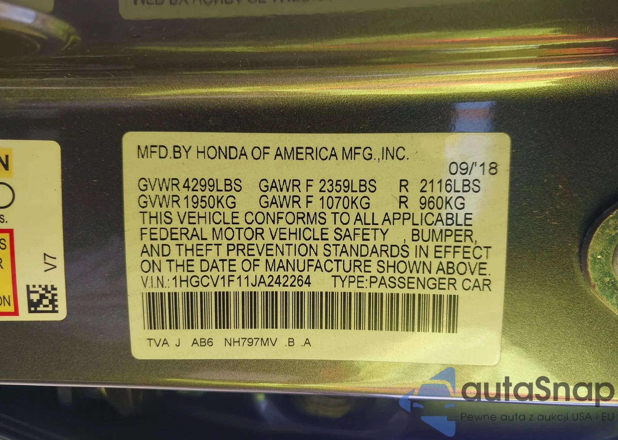 The car Honda Accord 2018 (VIN 1HGCV1F11JA242264) has not been auctioned before. The documents are clean, and the mileage matches or is below the market average. Sold by an insurance company – we recommend purchase. Delivery to the port will take approx. 6–8 weeks.