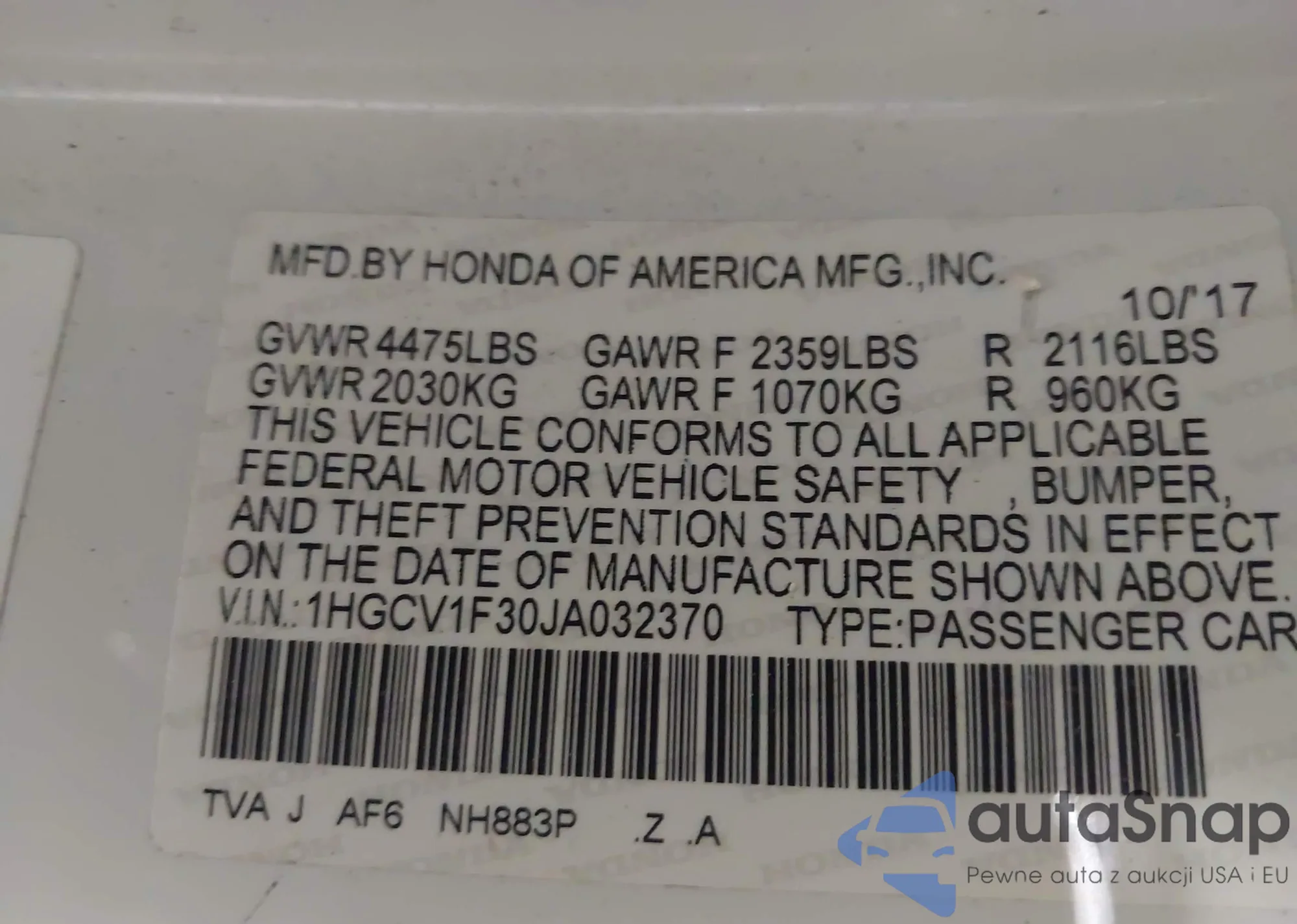 VIN: 1HGCV1F30JA032370