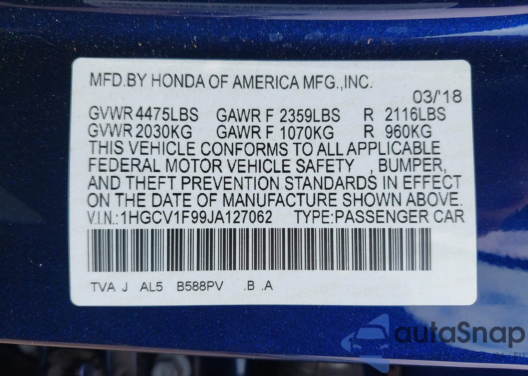 VIN: 1HGCV1F99JA127062