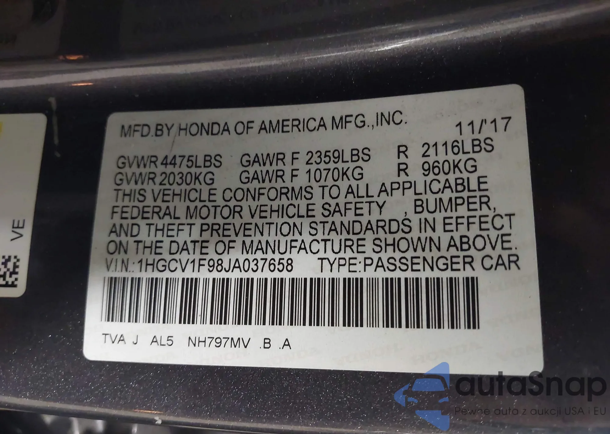 VIN: 1HGCV1F98JA037658