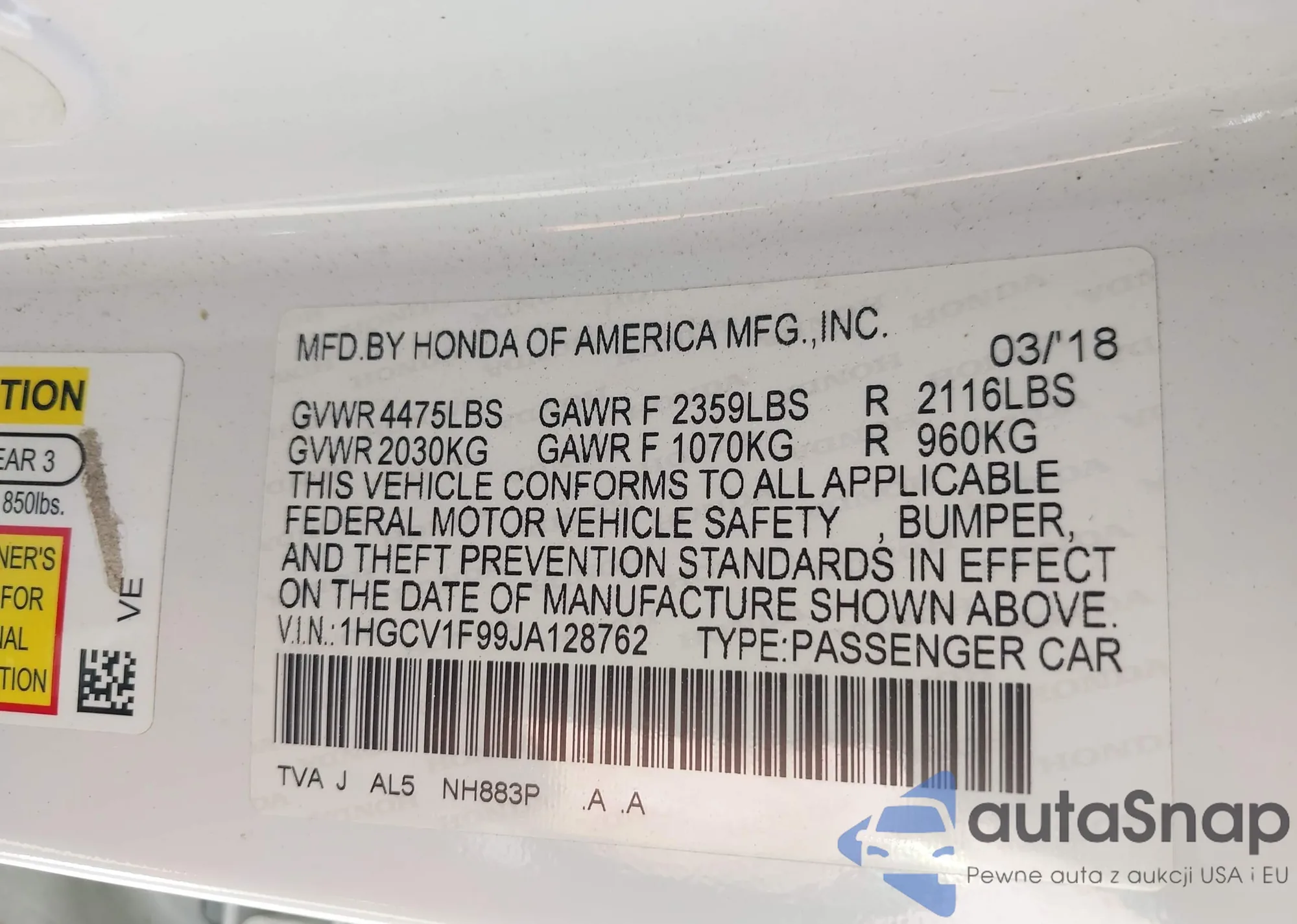 • VIN: 1HGCV1F99JA128762