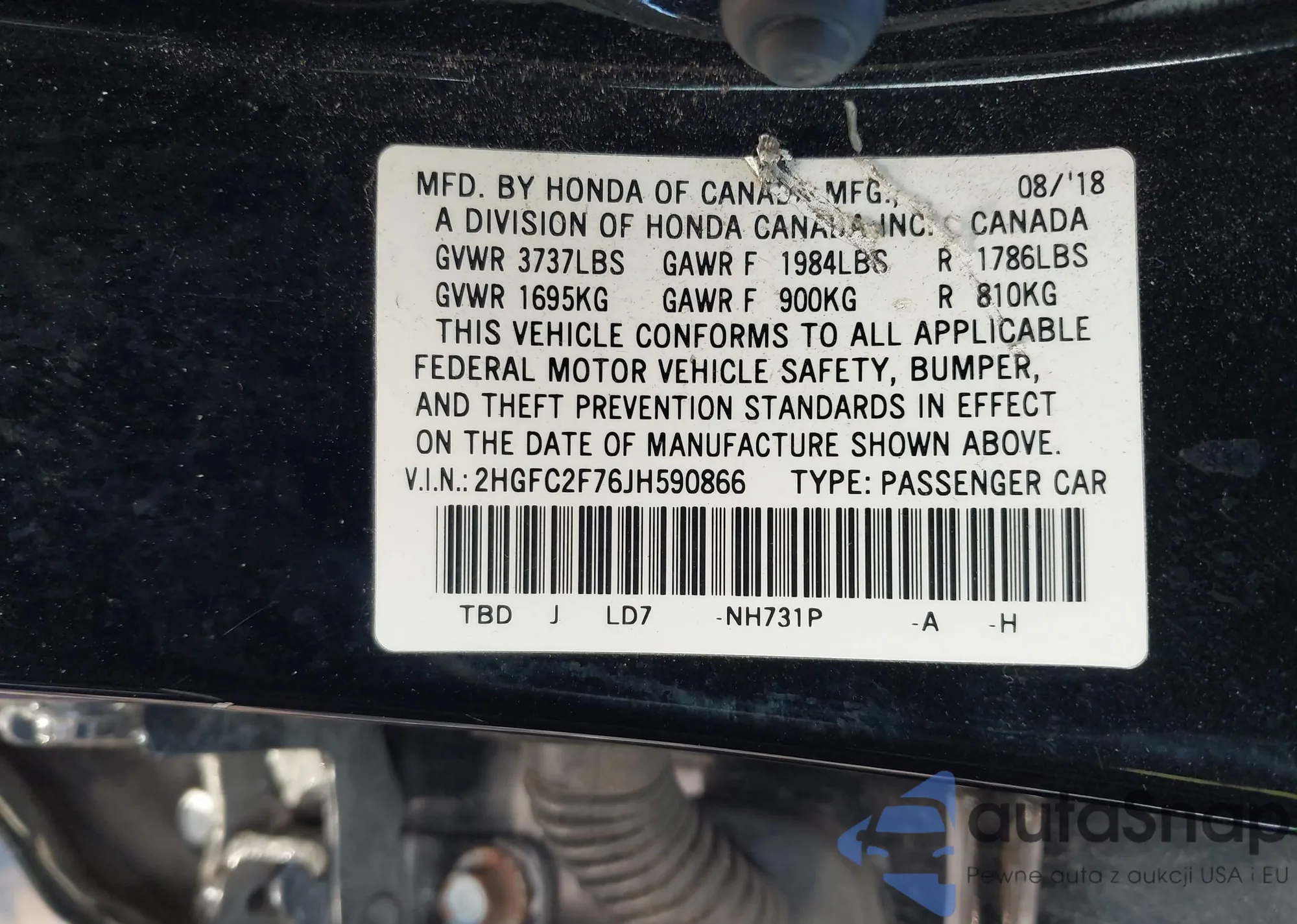 The car Honda Civic 2018 (VIN 2HGFC2F76JH590866) has not been auctioned before. The documents are clean, and the mileage matches or is below the market average. Sold by an insurance company – we recommend purchase. Delivery to the port will take approx. 6–8 weeks.