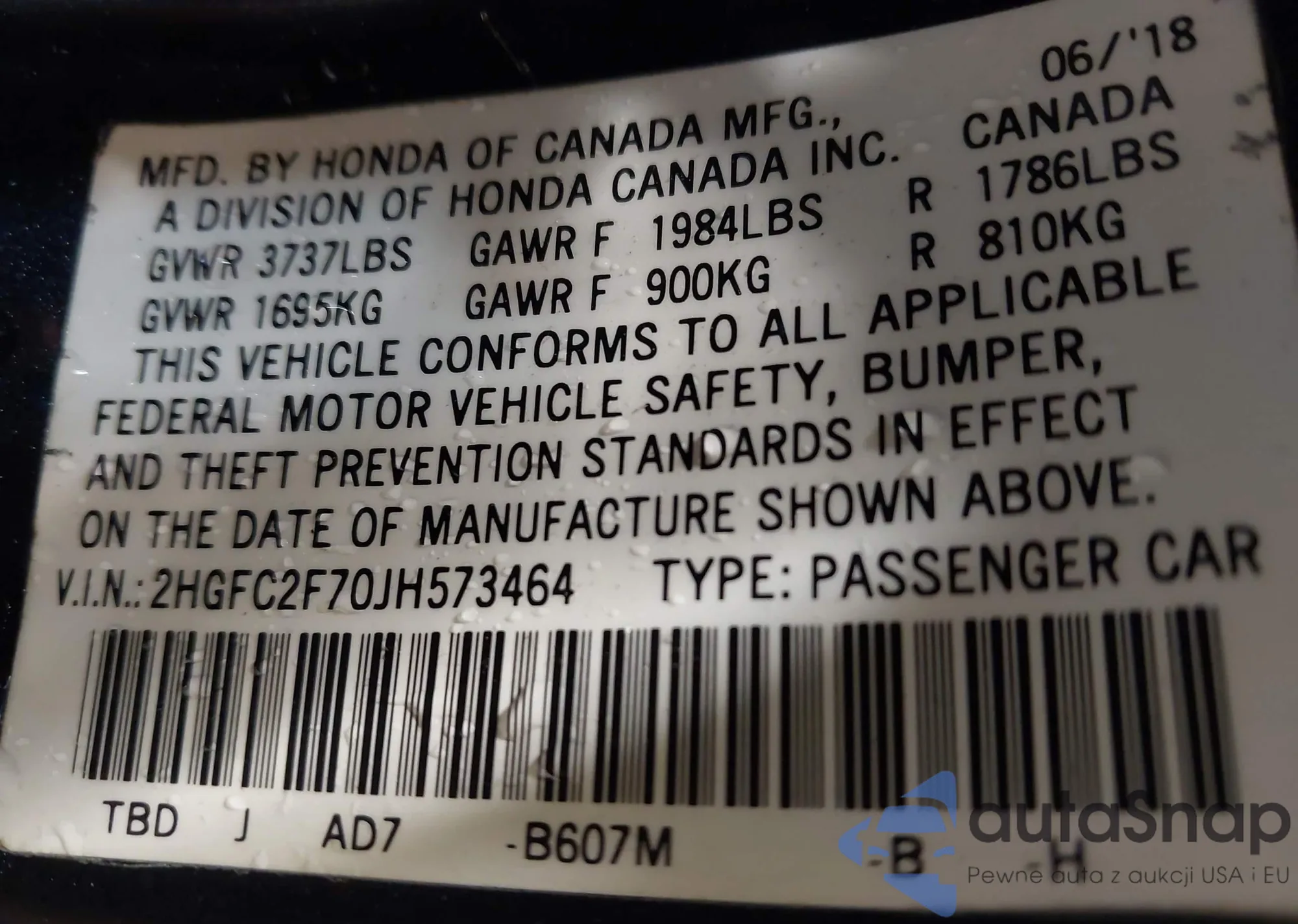 VIN: 2HGFC2F70JH573464
