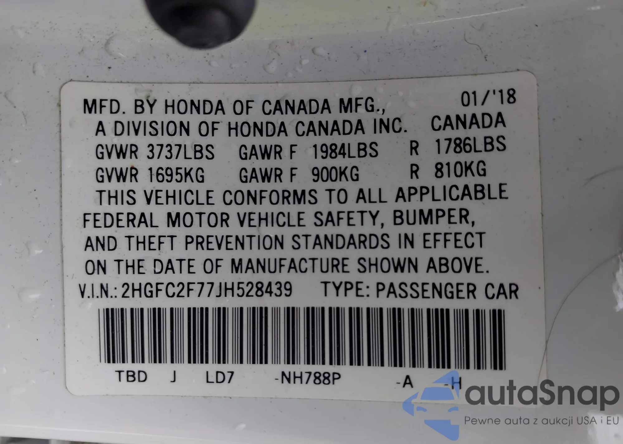 VIN: 2HGFC2F77JH528439
