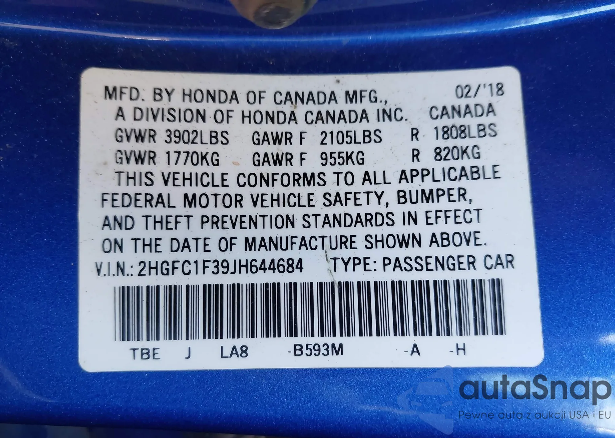 VIN: 2HGFC1F39JH644684