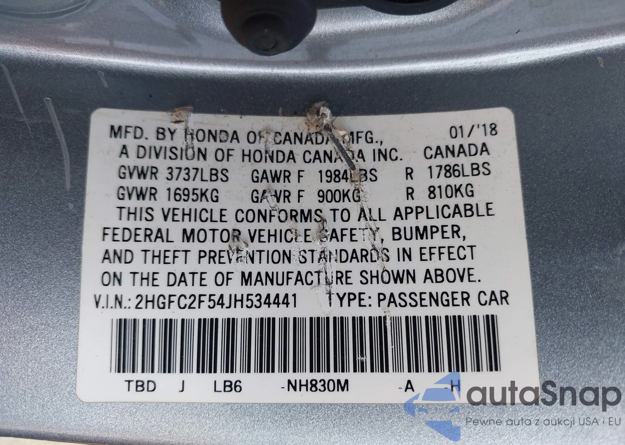 VIN: 2HGFC2F54JH534441