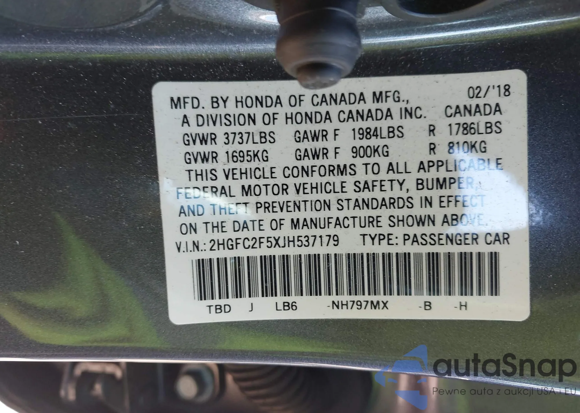 VIN: 2HGFC2F5XJH537179