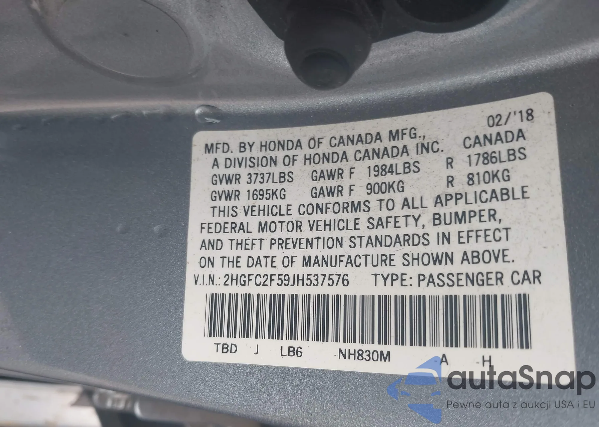 VIN: 2HGFC2F59JH537576