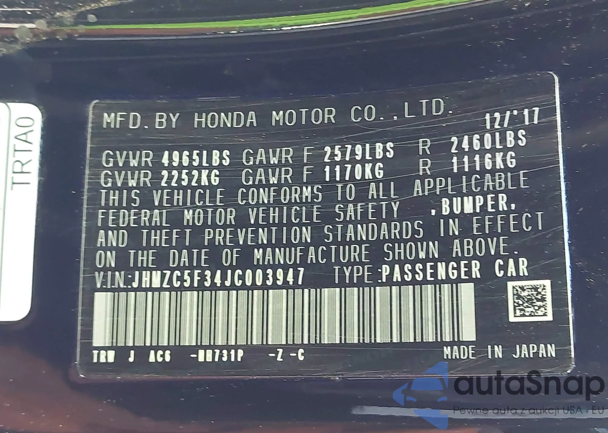 The car Honda Clarity 2018 (VIN JHMZC5F34JC003947) has not been auctioned before. The documents are clean, and the mileage matches or is below the market average. Sold by an insurance company – we recommend purchase. Delivery to the port will take approx. 6–8 weeks.