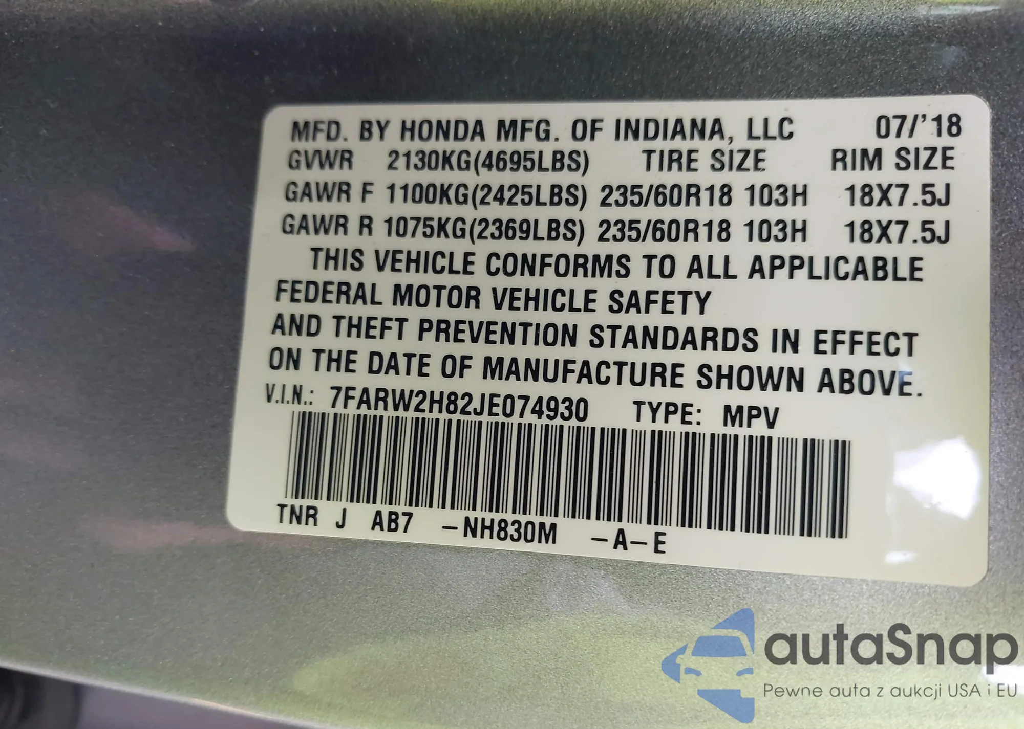 VIN: 7FARW2H82JE074930