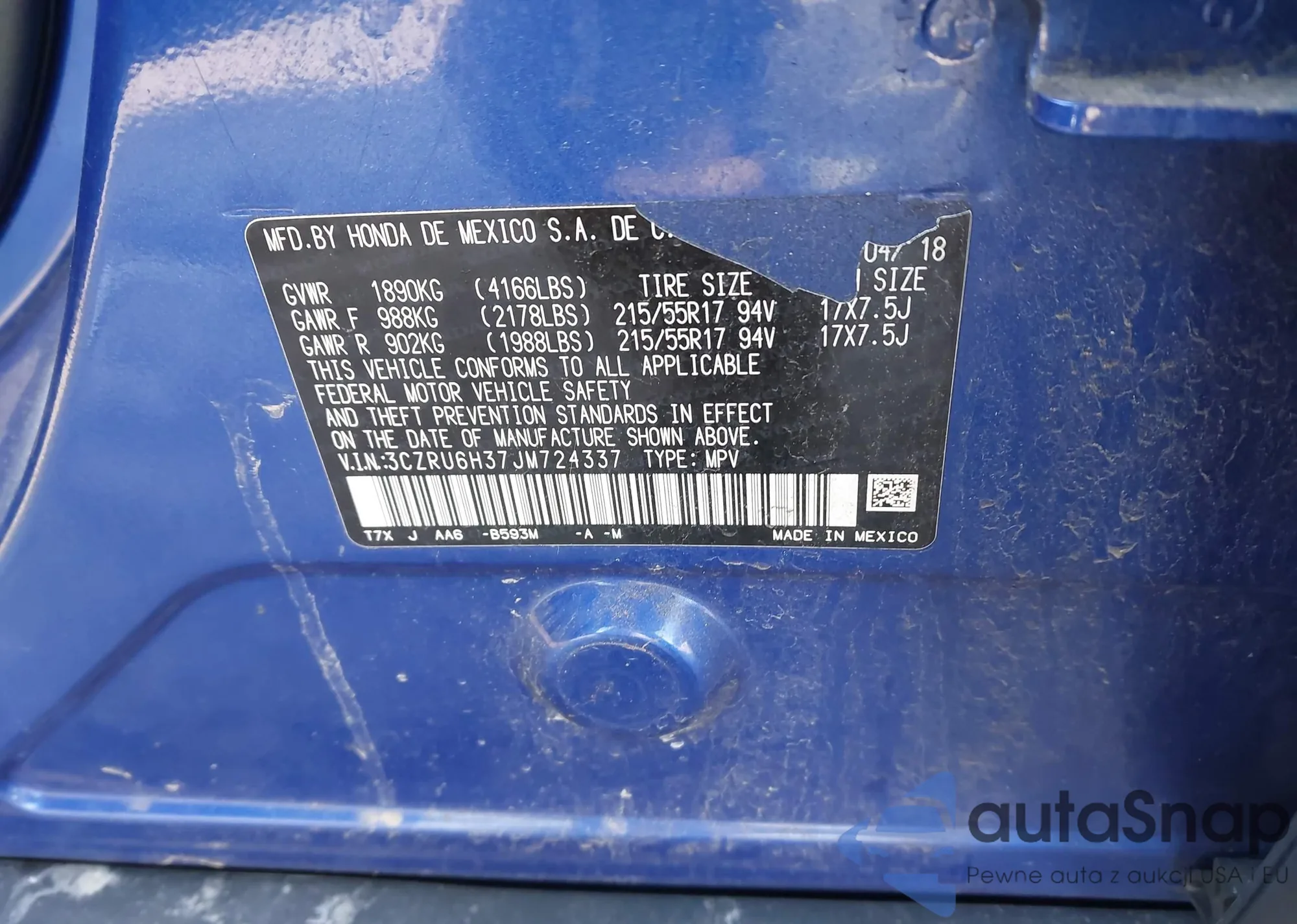 The car Honda HR-V 2018 (VIN 3CZRU6H37JM724337) has not been auctioned before. The documents are clean, and the mileage matches or is below the market average. Sold by an insurance company – we recommend purchase. Delivery to the port will take approx. 6–8 weeks.